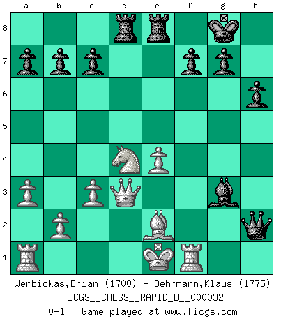 Last move : 0-1 2007 January 26 11:58:36 [Event "FICGS__CHESS__RAPID_B__000032"] [Site "FICGS"] [Date "2007.01.18"] [Round "1"] [White "Werbickas,Brian"] [Black "Behrmann,Klaus"] [Result "0-1"] [WhiteElo "1700"] [BlackElo "1775"] 1.f4 e5 2.fxe5 d6 3.exd6 Bxd6 4.Nf3 Nf6 5.d4 O-O 6.Bg5 Re8 7.Qd3 Nc6 8.a3 h6 9.Bxf6 Qxf6 10.e4 Bg4 11.Nbd2 Bxf3 12.Nxf3 Rad8 13.Be2 Nxd4 14.Nxd4 Be5 15.Rf1 Qh4+ 16.g3 Qxh2 17.c3 Bxg3+ 0-1 Bird : From gambit Kingside Castling by player Black (move 5) Player Black won this chess game. Follow this game move after move (download)Chess is above all, a fight ! (Emanuel Lasker) Das Schach ist nichts für kleine Geister, es beansprucht einen vollen Mann, der sich nicht sklavisch an das Überlieferte hält, sondern selbständig die Tiefen des Spiels zu ergründen sucht. (Wilhelm Steinitz) A la fecha, Fischer esta simplemente un nivel arriba de todos los mejores jugadores de Ajedrez del mundo. (John Jacobs) Les Echecs ont trois composantes : le temps, l'espace et le matériel en dernier. (Mikhail Tal) Unless I accept my faults I will most certainly doubt my virtues. (Hugh Prather)