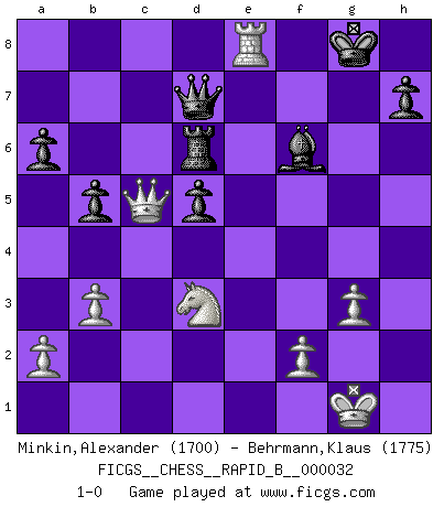 Last move : 1-0 2007 February 23 8:11:10 [Event "FICGS__CHESS__RAPID_B__000032"] [Site "FICGS"] [Date "2007.01.18"] [Round "1"] [White "Minkin,Alexander"] [Black "Behrmann,Klaus"] [Result "1-0"] [WhiteElo "1700"] [BlackElo "1775"] 1.d4 f5 2.g3 Nf6 3.Bg2 e6 4.c4 Be7 5.Nf3 O-O 6.O-O c6 7.Nbd2 d5 8.Qc2 Nbd7 9.Ne1 e5 10.cxd5 Nxd5 11.Bxd5+ cxd5 12.dxe5 Nxe5 13.Ndf3 Nc6 14.Ng2 Be6 15.Nf4 Qd7 16.b3 Rac8 17.Qd2 Bf7 18.Bb2 Rfd8 19.Rfd1 b6 20.Rac1 a6 21.e3 b5 22.Qd3 Bf8 23.Ng5 Nb4 24.Qb1 Bd6 25.Nxf7 Qxf7 26.Ba3 Rxc1 27.Rxc1 g5 28.Bxb4 Bxb4 29.Nd3 Bd6 30.Qb2 f4 31.exf4 gxf4 32.Qd4 fxg3 33.hxg3 Qf5 34.Qb6 Be7 35.Re1 Rd6 36.Qd4 Bf6 37.Qc5 Qd7 38.Re8+ 1-0 Dutch defense Kingside Castling by player Black (move 5) Kingside Castling by player White (move 6) Player White won this chess game. Follow this game move after move (download)I play correspondence chess because it is both art and science while chess is art only. (A player at FICGS) Die jungen Leute sollen verstehen, dass sie noch etwas von mir lernen können und müssen. (Viktor Kortschnoi) Yo adoro todas la posiciones. Denme una partida posicional difícil, y la jugaré. Pero posiciones totalmente ganadas, no las tolero. (Hein Donner) Dans le domaine de la peinture, de la gravure et de la sculpture, dès la première décennie de notre siècle, les artistes abandonnent la représentation de la partie d'échecs pour se concentrer sur les pièces, sur les échiquiers et sur toutes les variations auxquelles les unes et les autres peuvent donner lieu. On passe en quelque sorte d'un thème social à un thème musical (au sens de la musica médiévale, c'est-à-dire d'une notion qui inclue le rythme, l'harmonie, la construction et la déconstruction, etc.). Graphiquement et picturalement, l'échiquier apparaît comme une structure ouverte, dynamique, d'une richesse infinie, autorisant toutes les combinatoires et débouchant sur des mouvements et des rythmes de nature exponentielle. (Michel Pastoureau) Creativity is inventing, experimenting, growing, taking risks, breaking rules, making mistakes, and having fun. (Mary Lou Cook)