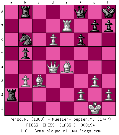 Last move : 1-0 2013 September 17 15:37:27 [Event "FICGS__CHESS__CLASS_C__000194"] [Site "FICGS"] [Date "2012.11.22"] [Round "1"] [White "Perod,Reuben"] [Black "Mueller-Toepler,Michael"] [Result "1-0"] [WhiteElo "1800"] [BlackElo "1747"] 1.d4 Nf6 2.c4 e6 3.g3 d5 4.Nf3 dxc4 5.Bg2 a6 6.O-O Nc6 7.e3 Bd7 8.Qe2 b5 9.b3 cxb3 10.axb3 Bd6 11.Bb2 O-O 12.Rc1 Nd5 13.Nc3 Ncb4 14.Ne4 a5 15.Nc5 Bc6 16.e4 Nb6 17.d5 exd5 18.Nd4 Bd7 19.Nxd7 Qxd7 20.e5 c5 21.exd6 cxd4 22.Qe5 f6 23.Qxd4 Rfb8 24.Rxa5 Rxa5 25.Qxb4 Ra7 26.Re1 Qc6 27.Bh3 Ra2 28.Re7 d4 29.Bg2 Qc8 30.Qxd4 Kh8 31.Be4 Qf8 32.Bc3 1-0 Catalan Opening Kingside Castling by player White (move 6) Kingside Castling by player Black (move 11) Player White won this chess game. Follow this game move after move (download)By playing at Chess then, we may learn: First: Foresight... Second: Circumspection... Third: Caution... And lastly, we learn by Chess the habit of not being discouraged by present bad appearances in the state of our affairs, the habit of hoping for a favorable chance, and that of persevering in the secrets of resources. (Benjamin Franklin) Ich hatte Zahnschmerzen im ersten Spiel. In der zweiten Partie tat mir der Kopf weh. In der dritten war es eine Rheuma-Attacke und während der vierten fühlte ich mich nicht gut. Und in der fünften? Nun, man muss doch nicht jedes Spiel gewinnen, oder? (Savielly Grigorievitsch Tartakower) El Ajedrez es un cuento de Hadas de las 1001 metidas de pata. (Savielly Tartakower) Si je n'étais pas joueur d'échecs, je serais le meilleur dans quelque chose d'autre. (Anatoli Karpov) When I took office, only high energy physicists had ever heard of what is called the World Wide Web... Now even my cat has its own page. (Bill Clinton, 1996)