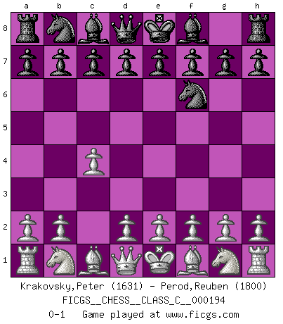 Last move : 0-1 2013 January 13 0:15:35 [Event "FICGS__CHESS__CLASS_C__000194"] [Site "FICGS"] [Date "2012.11.22"] [Round "1"] [White "Krakovsky,Peter"] [Black "Perod,Reuben"] [Result "0-1"] [WhiteElo "1631"] [BlackElo "1800"] 1.c4 Nf6 0-1 This chess game has been lost on time (started : 2012.11.22 6:46:8) English, 1...Nf6 (Anglo-Indian defense) Player Black won this chess game. Follow this game move after move (download)Chess is a matter of delicate judgment, knowing when to punch and how to duck. (Bobby Fischer) Wenn Spassky eine Figur opfert kannst du genauso gut aufgeben. Aber wenn Tal eine Figur opfert, spiel weiter. Er könnte noch eine weitere opfern, und dann ... wer weiß? (Miguel Najdorf) Bendita sea la memoria de aquel que dio al mundo este juego inmortal. (A. G. Gardiner) J'apprécie les joueurs d'est-indienne, c'est grâce à eux que je nourris ma famille depuis tant d'années. (Petrosian) Hold em is to stud what chess is to checkers. (Johnny Moss)