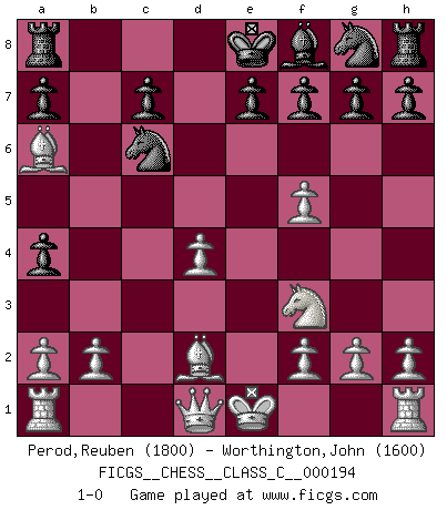 Last move : 1-0 2013 January 21 22:47:4 [Event "FICGS__CHESS__CLASS_C__000194"] [Site "FICGS"] [Date "2012.11.22"] [Round "1"] [White "Perod,Reuben"] [Black "Worthington,John"] [Result "1-0"] [WhiteElo "1800"] [BlackElo "1600"] 1.Nf3 d5 2.d4 Bf5 3.c4 Nc6 4.cxd5 Qxd5 5.Nc3 Qa5 6.Bd2 Qb6 7.Na4 Qa6 8.e4 b5 9.exf5 bxa4 10.Bxa6 1-0 Reti Opening Player White won this chess game. Follow this game move after move (download)I look one move ahead... the best ! (Siegbert Tarrasch) Wenn es im Universum noch irgendwo intelligente Lebewesen gibt, dann kennen sie Go. (Emanuel Lasker) Bobby Fischer es el mas grande genio de Ajedrez de todos los tiempos. (Alexander Kotov) On est toujours la mazette de quelqu'un d'autre. (Anonyme) Always two there are. No more no less. A master, and an apprentice. (Master Yoda in Star Wars ep.1)