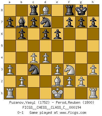 Last move : 0-1 2013 April 8 8:47:0 [Event "FICGS__CHESS__CLASS_C__000194"] [Site "FICGS"] [Date "2012.11.22"] [Round "1"] [White "Puzanov,Vasyl"] [Black "Perod,Reuben"] [Result "0-1"] [WhiteElo "1752"] [BlackElo "1800"] 1.d4 Nf6 2.c4 e6 3.Nc3 Bb4 4.Qc2 O-O 5.a3 Bxc3+ 6.Qxc3 b6 7.Bg5 Bb7 8.e3 d6 9.Nf3 Nbd7 10.h3 Rc8 11.Be2 Ne4 12.Bxd8 Nxc3 0-1 This chess game has been lost on time (started : 2012.11.22 6:46:8) Nimzo-Indian : Classical variation Kingside Castling by player Black (move 4) Player Black won this chess game. Follow this game move after move (download)The beauty of a move lies not in its' appearance but in the thought behind it. (Siegbert Tarrasch) Um dein Spiel zu verbessern musst du zuallererst das Endspiel studieren, denn diese kann unabhängig studiert werden. Die Eröffnung und das Mittelspiel müssen immer in Bezug gesetzt werden zum Endspiel. (José Raúl Capablanca) No todos los artistas son jugadores de Ajedrez, pero todos los jugadores de Ajedrez son artistas. (Marcel Duchamp) Dieu déplace le joueur, et celui-ci la pièce. Quel Dieu derrière Dieu commence donc la trame ? Arturo Perez-Reverte (prix de littérature policière 1993). Do you know these so called Volunteers don't even get paid! (Simpsons)
