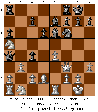 Last move : 1-0 2013 May 22 23:12:44 [Event "FICGS__CHESS__CLASS_C__000194"] [Site "FICGS"] [Date "2012.11.22"] [Round "1"] [White "Perod,Reuben"] [Black "Hancock,Sarah"] [Result "1-0"] [WhiteElo "1800"] [BlackElo "1614"] 1.e4 e5 2.Nf3 Nc6 3.Bb5 a6 4.Ba4 Nf6 5.O-O d6 6.Bxc6+ bxc6 7.d4 exd4 8.Nxd4 c5 9.Nc6 Qd7 10.Na5 Qa4 11.Bd2 Be7 12.Re1 Be6 13.Qf3 O-O 14.h3 c4 15.b3 1-0 Ruy Lopez : Steinitz defense deferred (Russian defense) Kingside Castling by player White (move 5) Kingside Castling by player Black (move 13) Player White won this chess game. Follow this game move after move (download)The tactician knows what to do when there is something to do; whereas the strategian knows what to do when there is nothing to do. (Gerald Abrahams) Schach verlangt totale Konzentration. (Robert James Fischer) Siempre es mejor sacrificar los hombres de tu oponente. (Savielly Tartakower) Votre seul travail dans les ouvertures est d'obtenir un milieu de partie jouable. (Lajos Portish) The hypothalamus is one of the most important parts of the brain, involved in many kinds of motivation, among other functions. The hypothalamus controls the 'Four Fs: Fighting, Fleeing, Feeding and Mating. (Unknown author)