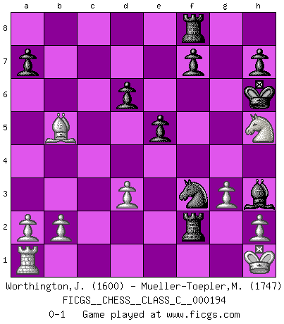 Last move : 0-1 2013 January 2 2:0:38 [Event "FICGS__CHESS__CLASS_C__000194"] [Site "FICGS"] [Date "2012.11.22"] [Round "1"] [White "Worthington,John"] [Black "Mueller-Toepler,Michael"] [Result "0-1"] [WhiteElo "1600"] [BlackElo "1747"] 1.e4 e5 2.Bc4 Nf6 3.d3 Nc6 4.Nf3 Bc5 5.O-O d6 6.Ng5 O-O 7.Nc3 Bg4 8.Qe1 Nd4 9.Nd5 Nxc2 10.Qc3 Nxa1 11.Be3 Nd7 12.Bxc5 Nxc5 13.Rxa1 Qxg5 14.Nxc7 Bh3 15.g3 Rac8 16.Nd5 b5 17.Bxb5 Nxe4 18.Qe1 Nd2 19.Qe3 Rc2 20.Qxg5 Nf3+ 21.Kh1 Rxf2 22.Nf6+ Kh8 23.Qxg7+ Kxg7 24.Nh5+ Kh6 0-1 Bishop's Opening : Berlin defense Kingside Castling by player White (move 5) Kingside Castling by player Black (move 6) Player Black won this chess game. Follow this game move after move (download)A sacrifice is best refuted by accepting it. (Wilhelm Steinitz) Wenn Dein Gegner dir ein Remis anbietet, versuch herauszufinden, weshalb er glaubt schlechter zu stehen. (Nigel Short) Ser exitoso en el Ajedrez te permite descubrir tu propia personalidad. Eso es lo que deseo para los niños de mi clase. (Saudin Robovic) D'abord les bases : Jouez et étudiez, puis étudiez et jouez, ensuite jouez et étudiez, puis étudiez et jouez. Deuxièmement : Donnez toujours le meilleur de vous-même ! (Ken Smith) Treat your password like your toothbrush. Don't let anybody else use it, and get a new one every six months. (Clifford Stoll)