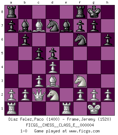 Last move : 1-0 2006 June 3 0:47:14 [Event "FICGS__CHESS__CLASS_E__000004"] [Site "FICGS"] [Date "2006.05.16"] [Round "1"] [White "Diaz Felez,Paco"] [Black "Frame,Jeremy"] [Result "1-0"] [WhiteElo "1400"] [BlackElo "1520"] 1.e4 e5 2.Nf3 Nf6 3.Nxe5 d6 4.Nf3 Nxe4 5.d4 d5 6.Bd3 Be7 7.O-O O-O 8.Re1 Nf6 9.Bg5 Nbd7 10.Qd2 h6 11.Bf4 c5 12.c3 b6 13.Qc2 Bb7 14.Nbd2 Qc7 15.Bxc7 1-0 Petrov : Classical attack, Mason variation Kingside Castling by player White (move 7) Kingside Castling by player Black (move 7) Player White won this chess game. Follow this game move after move (download)There must have been a time when men were demigods, or they could not have invented Chess. (Gustav Schenk) Jeder leidlich begabte Spieler, er braucht keineswegs hervorragend veranlagt zu sein, kann es zum Meister bringen. Aber das ist ja auch gar nicht nötig! Der richtige Standpunkt ist es, zu seinem Vergnügen zu spielen, und man glaube ja nicht, dass der Genuss proportional dem Können sei. (Siegbert Tarrasch) Yo nunca en mi vida he jugado la Defensa Francesa, que viene siendo la más aburrida de todas las Aperturas. (Wilhelm Steinitz) Il s'avisa de me proposer d'apprendre les échecs qu'il jouait un peu... me voilà forcené des échecs. J'achète un échiquier, je m'enferme dans ma chambre, j'y passe des jours et des nuits à vouloir apprendre par cur toutes les parties. (Jean-Jacques Rousseau, Confessions) Always remember that you are unique; just like everyone else. (Unknown)