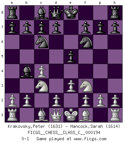 Last move : 0-1 2013 January 9 12:0:41 [Event "FICGS__CHESS__CLASS_C__000194"] [Site "FICGS"] [Date "2012.11.22"] [Round "1"] [White "Krakovsky,Peter"] [Black "Hancock,Sarah"] [Result "0-1"] [WhiteElo "1631"] [BlackElo "1614"] 1.c4 e5 2.Nc3 Nf6 3.Nf3 Nc6 4.e3 Bb4 0-1 This chess game has been lost on time (started : 2012.11.22 6:46:8) English Opening Player Black won this chess game. Follow this game move after move (download)In Chess, just as in life, today's bliss may be tomorrow's poison. (Assaic) Wenn du gegen Bobby spielst, ist es keine Frage von gewinnen oder verlieren. Es ist eine Frage des Überlebens. (Boris Vassilievich Spassky) Los libros de Ajedrez deben de usarse igual como usamos los anteojos: para mejorar la vista, aunque algunos jugadores los quieren usar como si ellos les otorgaran la vision. (José Raúl Capablanca) Toutes choses étant égales, c'est la conviction qui gagne. Alliée à une volonté de vaincre, elle sert de détonateur, suscite des idées, disperse les doutes et aide à penser clairement. (Robert Fischer) In my experience, there's no such thing as luck. (Obi-Wan Kenobi in Star Wars ep.4)