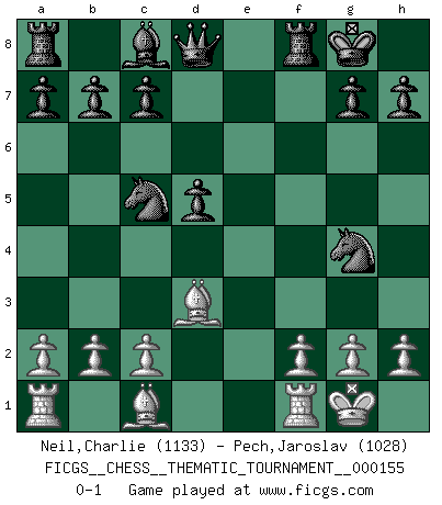 Last move : 0-1 2013 March 4 22:3:38 [Event "FICGS__CHESS__THEMATIC_TOURNAMENT__000155"] [Site "FICGS"] [Date "2012.11.23"] [Round "1"] [White "Neil,Charlie"] [Black "Pech,Jaroslav"] [Result "0-1"] [WhiteElo "1133"] [BlackElo "1028"] 1.e4 e5 2.Nf3 Nc6 3.Bb5 f5 4.d3 fxe4 5.dxe4 Nf6 6.Nc3 Bb4 7.Qd3 Bxc3+ 8.Qxc3 Nxe4 9.Qe3 d5 10.Nxe5 O-O 11.O-O Nxe5 12.Bd3 Ng4 13.Qc5 Nxc5 0-1 Ruy Lopez : Schliemann defense Kingside Castling by player Black (move 10) Kingside Castling by player White (move 11) Player Black won this chess game. Follow this game move after move (download)The stomach is an essential part of the Chess master. (Bent Larsen) Kein Großmeister ist normal. Sie unterscheiden sich nur im Ausmaß Ihrer Verrücktheit. (Viktor Kortschnoi) Ayuda a tus piezas para que ellas te puedan ayudar. (Paul Morphy) Il n'y a pas eu de défaite parce que je ne crois pas que cet ordinateur ait jamais existé. IBM a triché en refusant d'imprimer les modes de recherche de la machine. C'est évident, pendant le match, des coups décisifs ont été joués par des êtres humains. Aujourd'hui, les meilleurs spécialistes en informatique ne peuvent toujours pas expliquer comment Deep-Blue a pu jouer contre la logique des ordinateurs. IBM a gagné une guerre de communication, mais ils sont incapables de prouver que l'ordinateur a gagné tout seul. (Garry Kasparov) The greatest con, that he ever pulled... was making you believe... that he is you. (Revolver, movie)