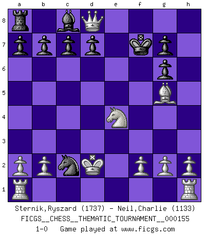 Last move : 1-0 2012 December 4 16:24:37 [Event "FICGS__CHESS__THEMATIC_TOURNAMENT__000155"] [Site "FICGS"] [Date "2012.11.23"] [Round "1"] [White "Sternik,Ryszard"] [Black "Neil,Charlie"] [Result "1-0"] [WhiteElo "1737"] [BlackElo "1133"] 1.e4 e5 2.Nf3 Nc6 3.Bb5 f5 4.Nc3 fxe4 5.Nxe4 Nge7 6.d4 Nxd4 7.Nxe5 Nxb5 8.Qh5+ Ng6 9.Bg5 Be7 10.Nxg6 Nd4 11.Nxe7 Kf8 12.Ng6+ hxg6 13.Qxh8+ Kf7 14.Qxd8 Nxc2+ 15.Kd2 1-0 Ruy Lopez : Schliemann defense, Berger variation Player White won this chess game. Follow this game move after move (download)Later, I began to succeed in decisive games. Perhaps because I realized a very simple truth: not only was I worried, but also my opponent. (Mikhail Tal) Woher wissen wir, daß der Neanderthaler Blindschach gespielt hat? -- Bei Ausgrabungen wurden keine Schachbretter und Figuren gefunden. (Anonymous) Una buena ofensiva y una buena defensa, comienzan ambas con un buen desarrollo. (Bruce A. Moon) Les ravages du H expliquent la différence de niveau entre Tal et Thal [Abergel]. I'm extremely disappointed. I send you out for exciting, new designer drugs, you come back with tomato sauce. (Gregory House, House M.D.)