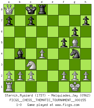 Last move : 1-0 2012 December 2 19:51:26 [Event "FICGS__CHESS__THEMATIC_TOURNAMENT__000155"] [Site "FICGS"] [Date "2012.11.23"] [Round "1"] [White "Sternik,Ryszard"] [Black "Melquiades,Jay"] [Result "1-0"] [WhiteElo "1737"] [BlackElo "0962"] 1.e4 e5 2.Nf3 Nc6 3.Bb5 f5 4.Nc3 d5 5.exd5 Bd7 6.dxc6 bxc6 7.Bc4 Nf6 8.Nxe5 Bb4 9.O-O Qe7 10.Re1 O-O-O 11.Nxd7 Qxd7 12.Be6 Rhe8 13.Bxd7+ Nxd7 14.Rxe8 Rxe8 15.d4 Nf6 16.Bg5 Ng4 17.Qf3 g6 18.Qxc6 Rd8 19.Qa8+ 1-0 Ruy Lopez : Schliemann defense, Berger variation Kingside Castling by player White (move 9) Queenside Castling by player Black (move 10) Player White won this chess game. Follow this game move after move (download)The Pin is mightier than the sword. (Fred Reinfeld) Im Blitz ist es einfacher mit einer Figur weniger anzugreifen, als sich mit einer Mehrfigur zu verteidigen. (Mikhail Nekhemyevich Tal) Si pudieramos observar el interior de la cabeza de un jugador de Ajedrez, encontraríamos ahí un mundo lleno de sentimientos, imágenes, ideas, emoción y pasión. (Alfred Binet) Les échecs sont un jeu par leur forme, un art par leur essence et une science par sa difficulté d'acquisition. Ils peuvent vous procurer autant de plaisir qu'un bon livre ou une belle musique, mais vous n'aurez une réelle joie que si vous arrivez à bien jouer. (Tigran Petrosian) Wisdom is the reward you get for a lifetime of listening when you'd have preferred to talk. (Doug Larson)