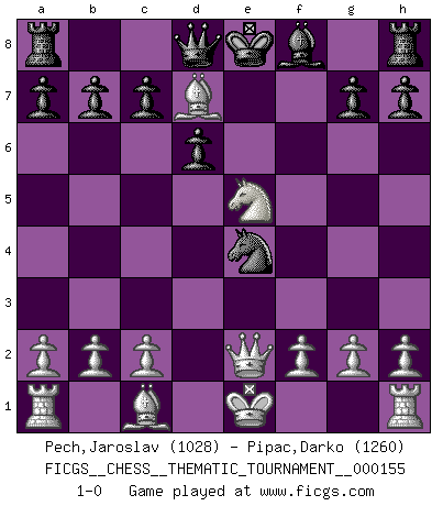 Last move : 1-0 2013 January 14 7:32:51 [Event "FICGS__CHESS__THEMATIC_TOURNAMENT__000155"] [Site "FICGS"] [Date "2012.11.23"] [Round "1"] [White "Pech,Jaroslav"] [Black "Pipac,Darko"] [Result "1-0"] [WhiteElo "1028"] [BlackElo "1260"] 1.e4 e5 2.Nf3 Nc6 3.Bb5 f5 4.Nc3 fxe4 5.Nxe4 Nf6 6.Qe2 d6 7.d4 Bd7 8.dxe5 Nxe5 9.Nxe5 Nxe4 10.Bxd7+ 1-0 Ruy Lopez : Schliemann defense, Berger variation Player White won this chess game. Follow this game move after move (download)Discovered check is the dive bomber of the Chessboard. (Reuben Fine) Ich habe die besten Aussichten, den ersten Preis zu gewinnen - denn jeder muss gegen Steinitz spielen, nur ich nicht! (Wilhelm Steinitz) No soy una persona materialista y por eso, no resiento la falta o pérdida del dinero. La ausencia de cosas mundanas carece de importancia. Ya que el Ajedrez es una forma en la que puedo ser tan materialista como yo desee sin tener la necesidad de vender mi alma. (Jamie Walter Adams) Toutes choses étant égales, c'est la conviction qui gagne. Alliée à une volonté de vaincre, elle sert de détonateur, suscite des idées, disperse les doutes et aide à penser clairement. (Robert Fischer) Men should grow up. - Yeah. And dogs should stop licking themselves. It's not gonna happen. (Gregory House to Dr. Cameron, House M.D.)