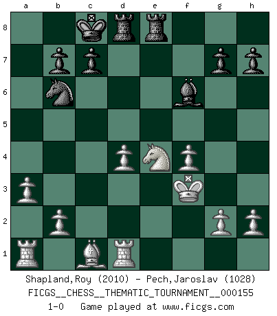 Last move : 1-0 2013 April 16 7:2:16 [Event "FICGS__CHESS__THEMATIC_TOURNAMENT__000155"] [Site "FICGS"] [Date "2012.11.23"] [Round "1"] [White "Shapland,Roy"] [Black "Pech,Jaroslav"] [Result "1-0"] [WhiteElo "2010"] [BlackElo "1028"] 1.e4 e5 2.Nf3 Nc6 3.Bb5 f5 4.Nc3 fxe4 5.Nxe4 d5 6.Nxe5 dxe4 7.Nxc6 Qg5 8.Qe2 Nf6 9.Nxa7 Bd7 10.Bxd7+ Nxd7 11.f4 Qc5 12.Nb5 Qxc2 13.d4 Bb4+ 14.Kf2 Qxe2+ 15.Kxe2 O-O-O 16.a3 Be7 17.Nc3 Nb6 18.Rd1 Rhe8 19.Nxe4 Bf6 20.Kf3 1-0 Ruy Lopez : Schliemann defense, Berger variation Queenside Castling by player Black (move 15) Player White won this chess game. Follow this game move after move (download)When you don't know what to do, wait for your opponent to get an idea - it's sure to be wrong. (Tarrasch) Wenn ich mich einlogge, glauben die Leute gewöhnlich nicht, dass ich es selbst bin und sie fangen an, mir dumme Fragen zu stellen. Und wenn sie es glauben, stellen sie wieder andere dumme Fragen. (Judith Polgar) Yo no le temo a Spassky. Todos saben que yo soy el mejor. Uno no necesita un torneo para probarlo. (Bobby Fischer) Un millionnaire : 'Monsieur Steinitz ! Vous ne participez aux tournois que pour l'argent, alors que moi je n'y viens que pour l'honneur.' Steinitz : 'Chacun joue pour ce qu'il n'a pas'... There are two kinds of people in the world, my friend. Those who have a loaded gun and those who dig. You dig ! (Blondie in The Good, The Bad and The Ugly)