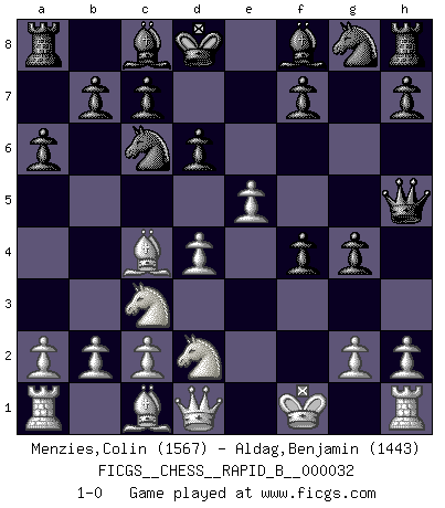 Last move : 1-0 2007 March 13 1:29:8 [Event "FICGS__CHESS__RAPID_B__000032"] [Site "FICGS"] [Date "2007.01.18"] [Round "1"] [White "Menzies,Colin"] [Black "Aldag,Benjamin"] [Result "1-0"] [WhiteElo "1567"] [BlackElo "1443"] 1.e4 e5 2.f4 exf4 3.Bc4 Qh4+ 4.Kf1 Nc6 5.Nf3 Qh5 6.d4 g5 7.Nc3 d6 8.Nb5 Kd8 9.e5 g4 10.Nd2 a6 11.Nc3 1-0 This chess game has been lost on time (started : 2007.01.18 17:34:17) KGA : Bishop's gambit, Boden defense Player White won this chess game. Follow this game move after move (download)The hardest game to win is a won game. (Emanuel Lasker) Mein Gehirn das ist mein zweitwichtigstes Organ [Aus dem Film: Der Schläfer]. (Woody Allen) El Ajedrez es 99 por ciento táctica. (Teichmann) Comme les marins qui ont mille raisons différentes d'aller en mer, les joueurs d'échecs en ont tout autant avant de s'installer devant une table et jouer... (Vincent Bertignac, philosophe) I'm extremely disappointed. I send you out for exciting, new designer drugs, you come back with tomato sauce. (Gregory House, House M.D.)
