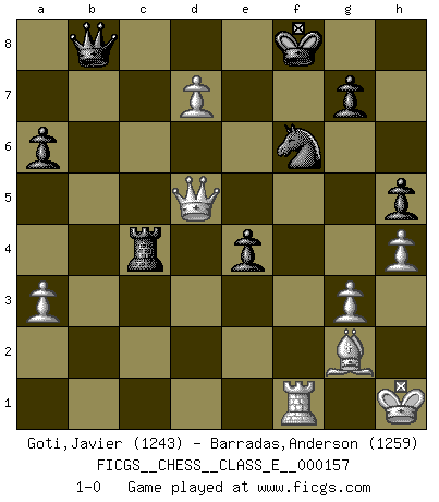 Last move : 1-0 2012 December 11 21:10:58 [Event "FICGS__CHESS__CLASS_E__000157"] [Site "FICGS"] [Date "2012.11.24"] [Round "1"] [White "Goti,Javier"] [Black "Barradas,Anderson"] [Result "1-0"] [WhiteElo "1243"] [BlackElo "1259"] 1.c4 Nf6 2.Nc3 e6 3.g3 c6 4.Bg2 a6 5.e3 Bb4 6.Nge2 b5 7.b3 O-O 8.O-O Bb7 9.a3 Bxc3 10.Nxc3 d5 11.d4 bxc4 12.bxc4 Nbd7 13.cxd5 cxd5 14.f3 Nb6 15.Bb2 Nc4 16.Bc1 Nd7 17.e4 Ndb6 18.Ne2 Bc6 19.h4 Ba4 20.Qd3 dxe4 21.fxe4 Ne5 22.Qe3 Ng4 23.Qf4 f5 24.exf5 exf5 25.Nc3 Bc2 26.d5 Rc8 27.Bb2 Rc4 28.Qd2 Be4 29.Nxe4 fxe4 30.Rxf8+ Qxf8 31.Qg5 Qf2+ 32.Kh1 Qxb2 33.Qd8+ Kf7 34.Rf1+ Nf6 35.Qd6 h5 36.Qe6+ Kf8 37.d6 Nbd5 38.d7 Qb8 39.Qxd5 1-0 English Opening Kingside Castling by player Black (move 7) Kingside Castling by player White (move 8) Player White won this chess game. Follow this game move after move (download)I like to say that Bobby Fischer was the greatest player ever. But what made Fischer a genius was his ability to blend an American freshness and pragmatism with Russian ideas about strategy. (Bruce Pandolfini) Habe Mut, dich deines eigenen Verstandes zu bedienen. (Immanuel Kant) El Ajedrez, como cualquier actividad creativa, solo puede existir a través del esfuerzo combinado de aquellos que tienen talento creativo y de aquellos que poseen la habilidad de organizar su trabajo creativo. (Mikhail Botvinnik) Que feriez-vous si vous étiez en train de jouer aux échecs et que la fin du monde arrive ? Je continuerais à jouer. (Saint Borromée) History is the quarrels of popes and kings, with wars or pestilences in every page; the men all so good for nothing, and hardly any women at all. (Jane Austen)