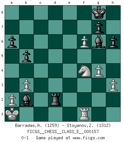 Last move : 0-1 2012 December 4 16:45:4 [Event "FICGS__CHESS__CLASS_E__000157"] [Site "FICGS"] [Date "2012.11.24"] [Round "1"] [White "Barradas,Anderson"] [Black "Stoyanov,Zdravko"] [Result "0-1"] [WhiteElo "1259"] [BlackElo "1312"] 1.e4 c5 2.Nf3 a6 3.d4 cxd4 4.Nxd4 e6 5.Nc3 h6 6.Bf4 Qe7 7.e5 f6 8.Qh5+ Qf7 9.Qxf7+ Kxf7 10.exf6 Nxf6 11.O-O-O d6 12.Nb3 Be7 13.Be2 e5 14.Bg3 Rd8 15.f4 e4 16.Rhf1 Kg8 17.h3 Nc6 18.Bc4+ Kh8 19.Bh4 b5 20.Bd5 Nxd5 21.Nxd5 Bxh4 22.Ne3 Ne7 23.Nc5 Rf8 24.Nxe4 d5 25.Nxd5 Nf5 26.g4 Ng3 27.Nxg3 Bxg3 28.f5 Bb7 29.Ne7 Rfd8 30.Rxd8+ Rxd8 31.b3 Bd6 32.Ng6+ Kg8 33.Nf4 Be4 34.Nh5 Ba3+ 35.Kb1 Rd2 36.f6 Bxc2+ 37.Ka1 Bg6 38.Nf4 Bb2+ 0-1 Sicilian : O'Kelly variation Queenside Castling by player White (move 11) Player Black won this chess game. Follow this game move after move (download)In complicated positions, Bobby Fischer hardly had to be afraid of anybody. (Paul Keres) Je mehr ich von der FIDE weiss, um so weniger verstehe ich. (Alexander Kalifman) Los finales de Peón son del Ajedrez lo que el cesped es del Golf. (Cecil Purdy) Il n'y a pas eu de défaite parce que je ne crois pas que cet ordinateur ait jamais existé. IBM a triché en refusant d'imprimer les modes de recherche de la machine. C'est évident, pendant le match, des coups décisifs ont été joués par des êtres humains. Aujourd'hui, les meilleurs spécialistes en informatique ne peuvent toujours pas expliquer comment Deep-Blue a pu jouer contre la logique des ordinateurs. IBM a gagné une guerre de communication, mais ils sont incapables de prouver que l'ordinateur a gagné tout seul. (Garry Kasparov) Horse racing is animated roulette. (Roger Kahn)