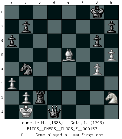 Last move : 0-1 2012 December 25 1:0:34 [Event "FICGS__CHESS__CLASS_E__000157"] [Site "FICGS"] [Date "2012.11.24"] [Round "1"] [White "Leurette,Marc-Antoine"] [Black "Goti,Javier"] [Result "0-1"] [WhiteElo "1326"] [BlackElo "1243"] 1.e4 c5 2.d4 cxd4 3.Qxd4 Nc6 4.Qe3 g6 5.Nc3 Bg7 6.Bd3 e6 7.Nf3 Nf6 8.Bd2 Ng4 9.Qg5 Qxg5 10.Bxg5 O-O 11.O-O-O Nxf2 12.Rhe1 Nxd1 13.Kxd1 d6 14.h4 d5 15.exd5 exd5 16.g3 Bg4 17.Be2 a6 18.Nh2 Be6 19.Kc1 Rac8 20.Bg4 Rfe8 21.Bxe6 Rxe6 22.Rxe6 fxe6 23.g4 d4 24.Ne4 e5 25.h5 Nb4 26.Nf6+ Bxf6 27.Bxf6 Rxc2+ 28.Kb1 d3 29.Bxe5 d2 30.a3 d1Q+ 0-1 Sicilian : Smith-Morra gambit Kingside Castling by player Black (move 10) Queenside Castling by player White (move 11) Promotion Queen by player Black (move 30) Player Black won this chess game. Follow this game move after move (download)You need not play well - just help your opponent to play badly. (Genrikh Chepukaitis) Smyslow ist ein Beweis dafür, dass ich noch zehn Jahre spielen kann! [der 75 jährige über den 85 jährigen] (Viktor Kortschnoi) Si no le temes a Spassky, entonces elimino el elemento del dinero. (Jim Slater) Le profane ne songe pas à la somme de jouissance dont il se prive, qui méconnaît ce jeu aux ressources aussi variées que passionnantes. (Jean-Marie Jeanton-Lamarche) If you don't practice you don't deserve to win. (Andre Agassi)