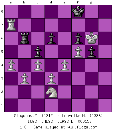 Last move : 1-0 2013 January 11 21:12:53 [Event "FICGS__CHESS__CLASS_E__000157"] [Site "FICGS"] [Date "2012.11.24"] [Round "1"] [White "Stoyanov,Zdravko"] [Black "Leurette,Marc-Antoine"] [Result "1-0"] [WhiteElo "1312"] [BlackElo "1326"] 1.e4 e5 2.Nf3 Nc6 3.Bb5 Nf6 4.Bxc6 bxc6 5.d3 Bb4+ 6.Bd2 Bxd2+ 7.Nbxd2 d6 8.h3 Qe7 9.O-O Ba6 10.c4 c5 11.Qa4+ Qd7 12.Qxa6 c6 13.Nb3 O-O 14.Na5 Qc8 15.Qxc6 Qxc6 16.Nxc6 a5 17.b3 Ra6 18.Ne7+ Kh8 19.a4 Re8 20.Nf5 Rb6 21.Nd2 g6 22.Nh6 Kg7 23.Ng4 Nxg4 24.hxg4 g5 25.g3 f6 26.Kg2 Rh8 27.f4 exf4 28.gxf4 Kg6 29.Kg3 h5 30.f5+ Kg7 31.gxh5 Rxh5 32.Kg4 Rh4+ 33.Kg3 Rb8 34.Rh1 Rxh1 35.Rxh1 Kf7 36.Rh7+ Kg8 37.Ra7 Kh8 38.Rxa5 Kg7 39.Kg4 Rb6 40.Kh5 Kf7 41.Ra7+ Kf8 42.Kg6 1-0 Ruy Lopez : Berlin defense Kingside Castling by player White (move 9) Kingside Castling by player Black (move 13) Player White won this chess game. Follow this game move after move (download)I played Chess with him and would have beaten him sometimes only he always took back his last move, and ran the game out differently. (Mark Twain) Wie gewinnt Tal? Er entwickelt alle seine Figuren in die Brettmitte und opfert sie dann irgendwo. (Robert James Fischer) No es suficiente ser un buen jugador, se debe también de jugar bién. (Siegbert Tarrasch) Les Echecs ont trois composantes : le temps, l'espace et le matériel en dernier. (Mikhail Tal) Even the best needles are not sharp at both ends. (Chinese proverb)