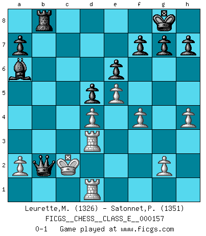 Last move : 0-1 2012 December 27 14:45:4 [Event "FICGS__CHESS__CLASS_E__000157"] [Site "FICGS"] [Date "2012.11.24"] [Round "1"] [White "Leurette,Marc-Antoine"] [Black "Satonnet,Patrick"] [Result "0-1"] [WhiteElo "1326"] [BlackElo "1351"] 1.e4 e6 2.d4 b6 3.Nf3 Bb7 4.Nc3 Bb4 5.Bd2 Nf6 6.e5 Bxc3 7.Bxc3 Ne4 8.Qd3 d5 9.Qe3 c5 10.Bb5+ Nc6 11.O-O-O O-O 12.dxc5 bxc5 13.Qxc5 Nxc5 14.h4 Ne4 15.Rdf1 Nxc3 16.bxc3 Qa5 17.Nd4 Nxd4 18.cxd4 Qxb5 19.Rd1 Rab8 20.Rd3 Rfc8 21.Rhd1 Ba6 22.f4 Rxc2+ 23.Kxc2 Qb2+ 0-1 French defense Queenside Castling by player White (move 11) Kingside Castling by player Black (move 11) Player Black won this chess game. Follow this game move after move (download)Every Pawn is a potential Queen. (James Mason) Die westlichen Werte sind eine Sprache, welche die Putin-Administration nicht versteht. (Garry Kasparov) Sin errores no puede haber brillantez. (Emanuel Lasker) C'est la seule position que je connaisse où les deux camps sont mals. Propos prêtés à V. Anand. Indecision is the key to flexibility. (Unknown)