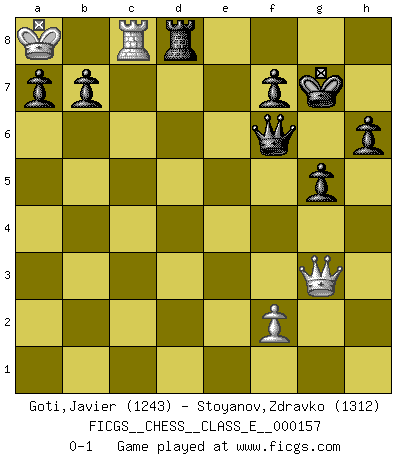 Last move : 0-1 2012 December 19 14:51:0 [Event "FICGS__CHESS__CLASS_E__000157"] [Site "FICGS"] [Date "2012.11.24"] [Round "1"] [White "Goti,Javier"] [Black "Stoyanov,Zdravko"] [Result "0-1"] [WhiteElo "1243"] [BlackElo "1312"] 1.c4 c5 2.Nc3 e6 3.e3 Nc6 4.Be2 Nf6 5.Nf3 Be7 6.O-O O-O 7.a3 Re8 8.d4 cxd4 9.exd4 d5 10.cxd5 exd5 11.b4 h6 12.h4 Ng4 13.g3 Bf6 14.Bf4 Be7 15.Nh2 Nxh2 16.Kxh2 Bxh4 17.Bf3 Bf6 18.Nb5 Re7 19.Nd6 Bxd4 20.Rb1 Be6 21.Qd3 Be5 22.Nf5 Bxf5 23.Qxf5 Nd4 24.Qg4 Bxf4 25.Qxf4 Ne2 26.Bxe2 Rxe2 27.Rbc1 Ra2 28.Rc3 Qb6 29.Kg2 d4 30.Rd3 Rd8 31.Rfd1 Qc6+ 32.Kg1 Qb6 33.Rxd4 Rxd4 34.Rxd4 Rxa3 35.Rd7 Ra1+ 36.Kh2 Qe6 37.Rd6 Qe7 38.Qd2 Qe5 39.Rd5 Qe4 40.g4 Qh1+ 41.Kg3 Rg1+ 42.Kf4 g5+ 43.Kf5 Qf3+ 44.Ke5 Rxg4 45.Kd6 Qf6+ 46.Kc7 Rc4+ 47.Rc5 Qb6+ 48.Kb8 Rxb4 49.Rc8+ Kg7 50.Qc3+ Rd4 51.Qg3 Qf6 52.Ka8 Rd8 0-1 English : Symmetrical variation Kingside Castling by player White (move 6) Kingside Castling by player Black (move 6) Player Black won this chess game. Follow this game move after move (download)Examine moves that smite! A good eye for smites is far more important than a knowledge of strategical principles. (Purdy) Ja, ich habe einmal eine Blitzpartie gespielt, es war in einem Zug, 1929. --im Interview 1989 (Mikhail Moiseyevich Botvinik) Yo no creo en la psicología. Yo creo en las buenas movidas. (Bobby Fischer) Les échecs, c'est l'art d'analyser. (Mikhail Botvinnik) Work expands to fill the time available. (C. Northcote Parkinson, in Parkinson's Laws)