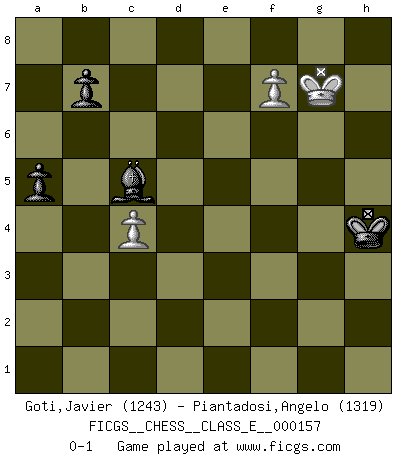 Last move : 0-1 2013 April 7 11:26:23 [Event "FICGS__CHESS__CLASS_E__000157"] [Site "FICGS"] [Date "2012.11.24"] [Round "1"] [White "Goti,Javier"] [Black "Piantadosi,Angelo"] [Result "0-1"] [WhiteElo "1243"] [BlackElo "1319"] 1.c4 e5 2.Nc3 Nf6 3.g3 d5 4.cxd5 Nxd5 5.Bg2 Nxc3 6.bxc3 c6 7.Bb2 Bf5 8.e4 Bg6 9.Ne2 Nd7 10.O-O Bc5 11.d4 exd4 12.cxd4 Bb6 13.Nf4 O-O 14.Nxg6 hxg6 15.f4 Nf6 16.Kh1 Re8 17.h3 Nxe4 18.Qd3 Nf6 19.Rfe1 Qd7 20.Rad1 Rxe1+ 21.Rxe1 Re8 22.Rxe8+ Qxe8 23.d5 Qe1+ 24.Qf1 Qxf1+ 25.Bxf1 Nxd5 26.Bc4 Ne3 27.Bb3 Kf8 28.Ba3+ Ke8 29.Kh2 Bd4 30.Bc1 Nf5 31.Bd2 Bf2 32.g4 Nd4 33.Bc3 Nxb3 34.axb3 Be3 35.Kg3 f6 36.f5 gxf5 37.gxf5 Kd7 38.h4 c5 39.Kg4 Kd6 40.Kh5 Kd5 41.Kg6 Ke4 42.Bxf6 gxf6 43.Kxf6 Kf4 44.Kg6 Kg4 45.f6 c4 46.f7 Bc5 47.bxc4 Kxh4 48.Kg7 a5 0-1 English : Bremen, reverse Dragon Kingside Castling by player White (move 10) Kingside Castling by player Black (move 13) 10 pieces endgame at move 42 : White KPPP , Black KBPPPP WHITE : King + 3 Pawns BLACK : King + 1 Bishop 4 Pawns 9 pieces endgame at move 43 : White KPPP , Black KBPPP WHITE : King + 3 Pawns BLACK : King + 1 Bishop 3 Pawns 8 pieces endgame at move 47 : White KPPP , Black KBPP WHITE : King + 3 Pawns BLACK : King + 1 Bishop 2 Pawns 7 pieces endgame at move 47 : White KPP , Black KBPP WHITE : King + 2 Pawns BLACK : King + 1 Bishop 2 Pawns Player Black won this chess game. Follow this game move after move (download)No one ever won a game by resigning. (Unknown) Garry Kasparov war erst in der Großmeister-Organisation GMA, dann in der Profischach-Vereinigung PCA, zum Schluss kehrte er wieder in den Schoß der FIDE zurück. Aber gut, manche Leute sind flexibel (Viswanathan Anand) Por la belleza de sus partidas, la claridad de su juego y lo brillante de sus ideas, Fischer se creó el mismo como un artista de la misma estatura como Brahms, Rembrandt y Shakespeare. (David Levy) Les Echecs ne sont pas pour les âmes timides. Ils requièrent un homme entier, qui ne s'arrête pas aveuglément à ce qui a été déjà établi, mais qui tente individuellement de sonder les profondeurs du jeu. (W. Steinitz) Games, world of games... There's always an opponent, and there's always a victim. (Revolver, movie)