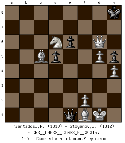 Last move : 1-0 2013 February 3 12:1:11 [Event "FICGS__CHESS__CLASS_E__000157"] [Site "FICGS"] [Date "2012.11.24"] [Round "1"] [White "Piantadosi,Angelo"] [Black "Stoyanov,Zdravko"] [Result "1-0"] [WhiteElo "1319"] [BlackElo "1312"] 1.e4 c5 2.c3 a6 3.d4 cxd4 4.cxd4 d6 5.Nf3 h6 6.Nc3 e6 7.Be2 b5 8.O-O Nf6 9.h3 Be7 10.Be3 O-O 11.Nd2 Bb7 12.Bf3 d5 13.e5 Nfd7 14.Rc1 Bb4 15.a3 Bxc3 16.Rxc3 Nb6 17.b3 a5 18.Qe2 b4 19.axb4 axb4 20.Rc2 Nc6 21.Rfc1 Qd7 22.g4 Rfc8 23.Nf1 Na5 24.Rxc8+ Rxc8 25.Rxc8+ Qxc8 26.Qb5 Nxb3 27.Qxb6 Ba6 28.Qxa6 Qb8 29.Qa4 Nxd4 30.Bxd4 b3 31.Qa3 g6 32.Nd2 Qb5 33.Qxb3 Qa5 34.Qc3 Qd8 35.Qe3 Kg7 36.Bg2 Kh7 37.Nf3 Qb8 38.Qf4 Kg7 39.Qf6+ Kg8 40.Be3 Qf8 41.h4 Qg7 42.g5 h5 43.Bc5 Kh7 44.Nd4 Qg8 45.Nb5 Qe8 46.Nd6 Qa8 47.Qxf7+ Kh8 48.Qxg6 Qa1+ 49.Kh2 Qxe5+ 50.Kg1 Qe1+ 51.Bf1 1-0 Sicilian : Alapin's variation (2.c3) Kingside Castling by player White (move 8) Kingside Castling by player Black (move 10) Player White won this chess game. Follow this game move after move (download)Later, I began to succeed in decisive games. Perhaps because I realized a very simple truth: not only was I worried, but also my opponent. (Mikhail Tal) Glücklicherweise sind Großmeister Ruben Fines reine Schachbücher weniger phallozentrisch [als seine Schachpsychologie] und deswegen auch weniger lächerlich. (Nigel Short) ¿Que sería del Ajedrez sin errores graciosos?. (Kurt Richter) La victoire dans une partie d'Echecs appartient la plupart du temps à celui qui voit un peu plus loin que l'adversaire. (Lasker) Luck never made a man wise. (Seneca, Letters to Lucilius)