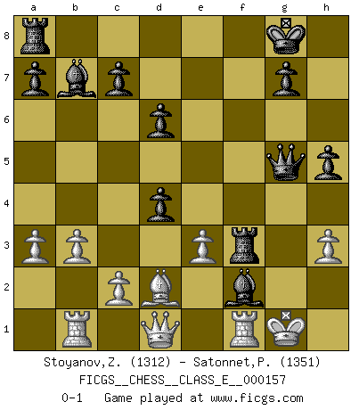 Last move : 0-1 2012 December 17 16:13:24 [Event "FICGS__CHESS__CLASS_E__000157"] [Site "FICGS"] [Date "2012.11.24"] [Round "1"] [White "Stoyanov,Zdravko"] [Black "Satonnet,Patrick"] [Result "0-1"] [WhiteElo "1312"] [BlackElo "1351"] 1.e4 e5 2.Nf3 Nc6 3.a3 Nf6 4.Bb5 d6 5.Bxc6+ bxc6 6.h3 Nxe4 7.d3 Nf6 8.O-O Be7 9.Nc3 O-O 10.Re1 Nd5 11.Nxd5 cxd5 12.b3 f5 13.Bd2 Bf6 14.Rb1 Bb7 15.Qc1 e4 16.dxe4 fxe4 17.Nh2 d4 18.Ng4 Bh4 19.g3 h5 20.Nh2 e3 21.fxe3 Bxg3 22.Rf1 Qg5 23.Nf3 Rxf3 24.Qd1 Bf2+ 0-1 King's pawn game Kingside Castling by player White (move 8) Kingside Castling by player Black (move 9) Player Black won this chess game. Follow this game move after move (download)In life, as in Chess, one's own Pawns block one's way. A man's very wealth, ease, leisure, children, books, which should help him to win, more often checkmate him. (Charles Buxton) Ich habe Putins Aufstieg an die Macht beobachtet und seine Politik, die demokratischen Institutionen meines Landes zu zerstören. (Garry Kasparov) El Ajedrez expande y enriquece tu mente. (Saudin Robovic) Avec des compensations pour le matériel en plus... (Anonyme) The intuitive mind is a sacred gift; the rational mind is a faithful servant. We have created a society that honors the servant but has forgotten the gift. (Albert Einstein)