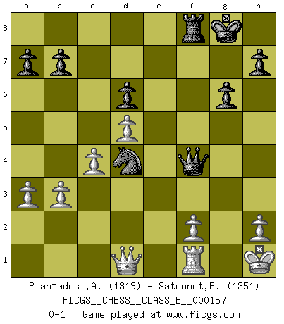 Last move : 0-1 2013 January 16 0:51:7 [Event "FICGS__CHESS__CLASS_E__000157"] [Site "FICGS"] [Date "2012.11.24"] [Round "1"] [White "Piantadosi,Angelo"] [Black "Satonnet,Patrick"] [Result "0-1"] [WhiteElo "1319"] [BlackElo "1351"] 1.c4 c5 2.Nc3 g6 3.Nf3 Bg7 4.g3 Nc6 5.Bg2 e5 6.d3 Nge7 7.O-O d6 8.Qc2 O-O 9.a3 Nd4 10.Qd1 Nxf3+ 11.Bxf3 Nc6 12.Nd5 Bh3 13.Bg2 Bxg2 14.Kxg2 f5 15.b3 f4 16.gxf4 exf4 17.Bxf4 Bxa1 18.Qxa1 Rxf4 19.Nxf4 Qg5+ 20.Kh1 Qxf4 21.Qd1 Rf8 22.e3 Qf5 23.d4 cxd4 24.exd4 Qf4 25.d5 Nd4 0-1 English : Symmetrical variation Kingside Castling by player White (move 7) Kingside Castling by player Black (move 8) Player Black won this chess game. Follow this game move after move (download)When the Chess game is over, the Pawn and the King go back to the same box. (Irish saying) Frage: Was machen Sie mit den Preisen? Anwort: Ich habe Angst, dass meine Freundin davon neue Kleider kauft. (Loek van Wely) El Ajedrez es despiadado: debes de estar preparado para matar gente. (Nigel Short) Les erreurs sont comme les malheurs, elles n'arrivent jamais seules. (Siegbert Tarrasch) But they are useless. They can only give you answers. (Pablo Picasso, about computers)