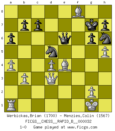 Last move : 1-0 2007 February 25 22:28:51 [Event "FICGS__CHESS__RAPID_B__000032"] [Site "FICGS"] [Date "2007.01.18"] [Round "1"] [White "Werbickas,Brian"] [Black "Menzies,Colin"] [Result "1-0"] [WhiteElo "1700"] [BlackElo "1567"] 1.f4 d5 2.Nf3 Nc6 3.e3 Bf5 4.Bb5 e6 5.b3 Nge7 6.Bb2 f6 7.O-O a6 8.Be2 Nc8 9.d3 Bc5 10.d4 Be7 11.Nh4 Be4 12.f5 exf5 13.Nxf5 O-O 14.Nxe7+ N6xe7 15.c4 Nd6 16.Nc3 Re8 17.Nxe4 Nxe4 18.Bd3 Ng5 19.Qh5 g6 20.Qg4 Kg7 21.h4 Nf7 22.h5 Qd6 23.a4 Nh6 24.Qf3 f5 25.cxd5 Nxd5 26.e4 fxe4 27.Bxe4 Rf8 28.Qd3 Rae8 29.Rxf8 Rxf8 30.Ba3 Qe6 31.Bxf8+ 1-0 Bird's Opening Kingside Castling by player White (move 7) Kingside Castling by player Black (move 13) Player White won this chess game. Follow this game move after move (download)Fischer sacrificed virtually everything most of us weakies (to use his term) value, respect, and cherish, for the sake of an artful, often beautiful board game, for the ambivalent privilege of being its greatest master. (Paul Kollar) Das Schachspiel übertrifft alle anderen Spiele so weit wie der Chimborasso einen Misthaufen. (Arthur Schopenhauer) Tu sabes, camarada Pachman, no disfruto el ser un Ministro, preferería jugar al Ajedrez como tu. (Che Guevara) Avec des compensations pour le matériel en plus... (Anonyme) A bird doesn't sing because it has an answer, it sings because it has a song. (Maya Angelou)