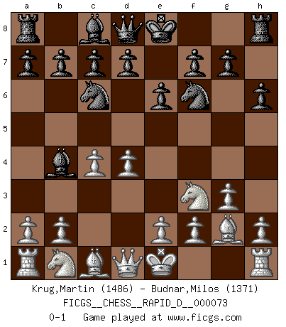Last move : 0-1 2013 January 15 12:21:26 [Event "FICGS__CHESS__RAPID_D__000073"] [Site "FICGS"] [Date "2012.11.24"] [Round "1"] [White "Krug,Martin"] [Black "Budnar,Milos"] [Result "0-1"] [WhiteElo "1486"] [BlackElo "1371"] 1.Nf3 Nf6 2.c4 Nc6 3.d4 e6 4.g3 h6 5.Bg2 Bb4+ 0-1 This chess game has been lost on time (started : 2012.11.24 19:1:37) Reti Opening Player Black won this chess game. Follow this game move after move (download)Best by test: 1. e4 (Bobby Fischer) Was ist der Unterschied zwischen einem Strassenarbeiter und einem Schachspieler? --Der Schachspieler bewegt sich ab und zu. (Anonymous) Una de estas pequeñas movidas modestas pudieran ser mas molestas a tu oponente que la amenaza mas grande. (Siegbert Tarrasch) Il a essayé de se convaincre qu'il pourrait empêcher toutes les erreurs et ne jamais perdre. L'horreur ! Gary Kasparov au sujet de Robert Fischer. Wisdom doesn't necessarily come with age. Sometimes age just shows up all by itself. (Tom Wilson)