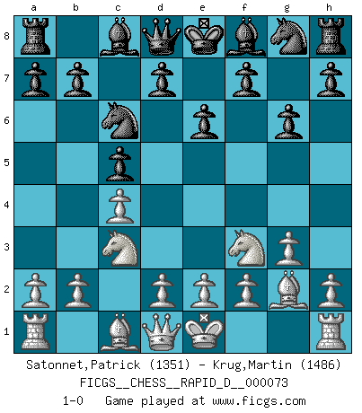 Last move : 1-0 2013 January 5 23:38:48 [Event "FICGS__CHESS__RAPID_D__000073"] [Site "FICGS"] [Date "2012.11.24"] [Round "1"] [White "Satonnet,Patrick"] [Black "Krug,Martin"] [Result "1-0"] [WhiteElo "1351"] [BlackElo "1486"] 1.c4 c5 2.Nc3 Nc6 3.g3 e6 4.Bg2 g6 5.Nf3 1-0 This chess game has been lost on time (started : 2012.11.24 19:1:37) English : Symmetrical variation Player White won this chess game. Follow this game move after move (download)Suddenly it was obvious to me in my analysis I had missed what Fischer had found with the greatest of ease at the board. (Mikhail Botvinnik) Ein Teil des Fehlers ist immer korrekt. (Savielly Grigorievitsch Tartakower) La vida es como el Ajedrez, con lucha, competición y eventos buenos y malos. (Benjamin Franklin) Seul un grand joueur sait à quel point il joue faiblement. (Xavier Tartacover) I'll be back. (Arnold Schwarzenegger)