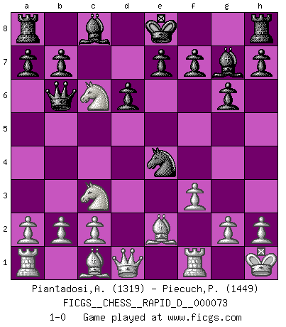 Last move : 1-0 2013 January 23 22:8:6 [Event "FICGS__CHESS__RAPID_D__000073"] [Site "FICGS"] [Date "2012.11.24"] [Round "1"] [White "Piantadosi,Angelo"] [Black "Piecuch,Patryk"] [Result "1-0"] [WhiteElo "1319"] [BlackElo "1449"] 1.e4 c5 2.Nf3 Nc6 3.d4 cxd4 4.Nxd4 Nf6 5.Nc3 d6 6.Be2 g6 7.O-O Bg7 8.f3 Nxe4 9.Nxc6 Qb6+ 10.Kh1 1-0 Sicilian : Classical Kingside Castling by player White (move 7) Player White won this chess game. Follow this game move after move (download)The enormous mental resilience, without which no Chess player can exist, was so much taken up by Chess that he could never free his mind of this game. (Albert Einstein) Das Schach ist nichts für kleine Geister, es beansprucht einen vollen Mann, der sich nicht sklavisch an das Überlieferte hält, sondern selbständig die Tiefen des Spiels zu ergründen sucht. (Wilhelm Steinitz) Yo siempre he tenido un ligero sentimiento de lástima por una persona que no tiene conocimiento del Ajedrez. (Siegbert Tarrasch) Lorsque vous vous retrouvez devant une position atroce, ne tendez pas un ultime piège dérisoire avec l'intention d'abandonner si l'adversaire le déjoue ! Faites-vous plutôt un devoir de résister comme si votre vie en dépendait. Jouez le coup qui vous déplairait au centuple si vous étiez dans la peau de votre tortionnaire ! Perfection is achieved, not when there is nothing more to add, but when there is nothing left to take away. (Antoine de Saint-Exupéry)