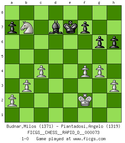 Last move : 1-0 2013 February 11 21:5:10 [Event "FICGS__CHESS__RAPID_D__000073"] [Site "FICGS"] [Date "2012.11.24"] [Round "1"] [White "Budnar,Milos"] [Black "Piantadosi,Angelo"] [Result "1-0"] [WhiteElo "1371"] [BlackElo "1319"] 1.e4 Nf6 2.e5 Nd5 3.d4 d6 4.Nf3 g6 5.Bc4 Nb6 6.Bb3 Bg7 7.Ng5 e6 8.Qf3 Qe7 9.O-O h6 10.Nh3 N8d7 11.exd6 Qxd6 12.c3 O-O 13.Bf4 e5 14.dxe5 Bxe5 15.Rd1 Qf6 16.Nd2 Bxf4 17.Qxf4 Qxf4 18.Nxf4 Nc5 19.h3 Nxb3 20.Nxb3 Bd7 21.Nc5 Bc6 22.Rd4 Rad8 23.Rad1 Rxd4 24.Rxd4 Re8 25.Rd2 Nc4 26.Rc2 Ne5 27.c4 Nd7 28.Nxd7 Bxd7 29.b3 c6 30.Re2 Rxe2 31.Nxe2 Kg7 32.f4 Kf6 33.Kf2 c5 34.g4 Bc6 35.Ng3 Bd7 36.Ne4+ Ke6 37.Nxc5+ Ke7 38.Nxb7 1-0 Alekhine's defense : Modern, Fianchetto variation Kingside Castling by player White (move 9) Kingside Castling by player Black (move 12) Player White won this chess game. Follow this game move after move (download)You cannot play at Chess if you are kind-hearted. (French Proverb) Wer sich die Fähigkeit anerziehen will im Schach selbstständig zu denken, der muß alles meiden, was leblos ist: ausgeklügelte Theorien, die sich auf sehr wenige Beispiele und eine Menge Hirngespinste stützen. (Emanuel Lasker) Te sientas frente a un tablero y repentinamente tu corazón brinca. Tu mano tiembla al tomar una pieza y moverla. Pero lo que el Ajedrez te enseña es que tu debes permanecer ahí con calma y pensar de que si realmente es una buena idea o de que si hay otras ideas mejores. (Stanley Kubrick) Le système Elo représente seulement une moyenne. Il est simplement un indicateur de votre stabilité. (Anatoli Karpov) There is no instance of a country having benefited from prolonged warfare. (Sun Tzu)