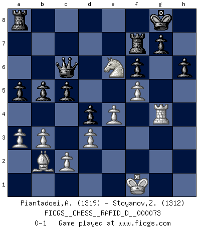 Last move : 0-1 2013 January 12 4:44:52 [Event "FICGS__CHESS__RAPID_D__000073"] [Site "FICGS"] [Date "2012.11.24"] [Round "1"] [White "Piantadosi,Angelo"] [Black "Stoyanov,Zdravko"] [Result "0-1"] [WhiteElo "1319"] [BlackElo "1312"] 1.b3 c5 2.Bb2 a6 3.Nf3 Nc6 4.g3 e6 5.Bg2 d5 6.O-O Nf6 7.d3 Bd6 8.Nbd2 O-O 9.e4 d4 10.Ne1 e5 11.f4 exf4 12.gxf4 Bg4 13.Bf3 Bh3 14.Bg2 Bg4 15.Bf3 b5 16.Bxg4 Nxg4 17.Qxg4 h6 18.Nef3 Nb4 19.Rfc1 a5 20.a3 Nc6 21.Kf2 Qc7 22.f5 Bxh2 23.Rh1 Bf4 24.Rag1 f6 25.Nh4 Bxd2 26.Ng6 Rf7 27.Nf4 Be3+ 28.Kf1 Bxg1 29.Rxg1 Ne5 30.Ne6 Nxg4 31.Rxg4 Qc6 0-1 Nimzovich-Larsen attack : English variation Kingside Castling by player White (move 6) Kingside Castling by player Black (move 8) Player Black won this chess game. Follow this game move after move (download)Kasparov : J'adoube , Ivanchuk : S'il vous plaît ! (Garry Kasparov & Vassily Ivanchuk, Linares 1997) Die jungen Leute sollen verstehen, dass sie noch etwas von mir lernen können – und müssen. (Viktor Kortschnoi) Mis oponentes también hacen buenas movidas. A veces yo no tomo esas cosas en consideración. (Bobby Fischer) Dans le domaine de la peinture, de la gravure et de la sculpture, dès la première décennie de notre siècle, les artistes abandonnent la représentation de la partie d'échecs pour se concentrer sur les pièces, sur les échiquiers et sur toutes les variations auxquelles les unes et les autres peuvent donner lieu. On passe en quelque sorte d'un thème social à un thème musical (au sens de la musica médiévale, c'est-à -dire d'une notion qui inclue le rythme, l'harmonie, la construction et la déconstruction, etc.). Graphiquement et picturalement, l'échiquier apparaît comme une structure ouverte, dynamique, d'une richesse infinie, autorisant toutes les combinatoires et débouchant sur des mouvements et des rythmes de nature exponentielle. (Michel Pastoureau) Creativity is inventing, experimenting, growing, taking risks, breaking rules, making mistakes, and having fun. (Mary Lou Cook)