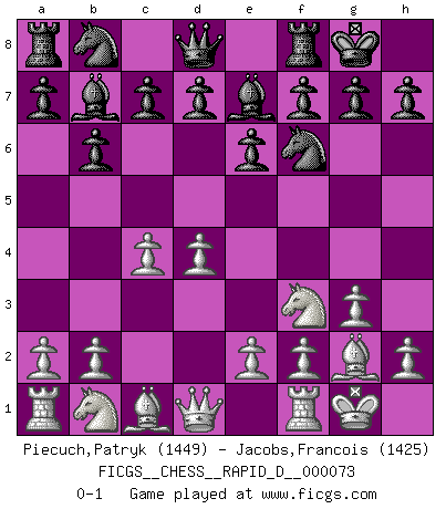 Last move : 0-1 2013 January 23 22:6:40 [Event "FICGS__CHESS__RAPID_D__000073"] [Site "FICGS"] [Date "2012.11.24"] [Round "1"] [White "Piecuch,Patryk"] [Black "Jacobs,Francois"] [Result "0-1"] [WhiteElo "1449"] [BlackElo "1425"] 1.c4 Nf6 2.d4 e6 3.Nf3 b6 4.g3 Bb7 5.Bg2 Be7 6.O-O O-O 0-1 English, 1...Nf6 (Anglo-Indian defense) Kingside Castling by player White (move 6) Kingside Castling by player Black (move 6) Player Black won this chess game. Follow this game move after move (download)In Chess, as it is played by masters, chance is practically eliminated. (Emanuel Lasker) Ich bin der einzige Schachspieler, der sich während der Vorbereitungen zum Turnier verletzt hat. (Woody Allen) Nada excita más a Grandes Maestros aburridos que una novedad teórica. (Dominic Lawson) Le succès, c'est être capable d'aller d'échec en échec sans perdre son enthousiasme. (Winston Churchill) I take risks, sometimes patients die, but not taking risks causes more patients to die. So I guess my biggest problem is I've been cursed with the ability to do the math. (Gregory House, House M.D.)