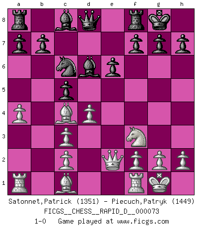 Last move : 1-0 2013 January 14 0:20:2 [Event "FICGS__CHESS__RAPID_D__000073"] [Site "FICGS"] [Date "2012.11.24"] [Round "1"] [White "Satonnet,Patrick"] [Black "Piecuch,Patryk"] [Result "1-0"] [WhiteElo "1351"] [BlackElo "1449"] 1.e4 d5 2.exd5 Nf6 3.Nc3 Nxd5 4.Bc4 e6 5.Nf3 Nxc3 6.bxc3 c5 7.O-O Bd6 8.Qe2 O-O 9.a4 Nc6 10.d4 1-0 This chess game has been lost on time (started : 2012.11.24 19:1:37) Scandinavian defense Kingside Castling by player White (move 7) Kingside Castling by player Black (move 8) Player White won this chess game. Follow this game move after move (download)Chess is like war on a board. (Bobby Fischer) Der Verteidiger gebe der Gewalt nach, aber nur der Gewalt. Er schaffe sich nicht freiwillig, etwa aus Blindheit oder aus Schrecken, irgendwelche Schwächen. Er lasse sich nicht bluffen. (Emanuel Lasker) Puntos débiles o agujeros en la posición de tu oponente deben de ser ocupados por piezas, no Peones. (Siegbert Tarrasch) Si le désir cupide (et stupide) de gagner est une inépuisable source de souffrance, une combinaison brillante sur l'échiquier est une découverte : le coquelicot qui s'épanouit lorsque apparaît la Voie Lactée. (Arrabal) The faster the computer, the slower the brain. (Thibault de Vassal)