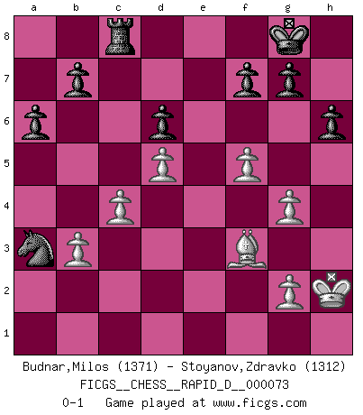 Last move : 0-1 2013 January 2 18:17:47 [Event "FICGS__CHESS__RAPID_D__000073"] [Site "FICGS"] [Date "2012.11.24"] [Round "1"] [White "Budnar,Milos"] [Black "Stoyanov,Zdravko"] [Result "0-1"] [WhiteElo "1371"] [BlackElo "1312"] 1.e4 c5 2.Bb5 a6 3.Be2 Nc6 4.Nf3 h6 5.O-O e5 6.h3 Nf6 7.Nc3 Be7 8.d3 O-O 9.a3 Re8 10.Nd5 Nxd5 11.exd5 Nb8 12.Nxe5 d6 13.Ng4 Nd7 14.d4 cxd4 15.Qxd4 Nc5 16.Re1 Bxg4 17.Qxg4 Bg5 18.Bxg5 Qxg5 19.Bf3 Re5 20.Rad1 Rae8 21.b3 Rxe1+ 22.Kh2 Qxg4 23.hxg4 Rxd1 24.Bxd1 Ne4 25.f4 Nc3 26.Bf3 Rc8 27.f5 Nb1 28.c4 Nxa3 0-1 Sicilian defense Kingside Castling by player White (move 5) Kingside Castling by player Black (move 8) Player Black won this chess game. Follow this game move after move (download)I am still a victim of Chess. It has all the beauty of art and much more. It cannot be commercialized. Chess is much purer than art in its social position. (Marcel Duchamp) Ich glaube, ich kenne inzwischen die Gründe für mein Versagen: schachliche Charakterfehler. Ich war nie ein Wunderkind und in meiner gesamten menschlichen Entwicklung immer zu langsam. (Viktor Kortschnoi) Si el ingenio solamente fuese necesario para lucirse, las mujeres serían las mejores jugadoras de Ajedrez del mundo. (Albin) Fischer est le meilleur joueur du monde et Karpov n'est qu'un joueur de bistrot. (Garry Kasparov, agé de 16 ans) Crush them ! Make them suffer ! (General Grievous in Star Wars ep.3)