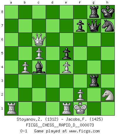 Last move : 0-1 2013 January 4 11:6:29 [Event "FICGS__CHESS__RAPID_D__000073"] [Site "FICGS"] [Date "2012.11.24"] [Round "1"] [White "Stoyanov,Zdravko"] [Black "Jacobs,Francois"] [Result "0-1"] [WhiteElo "1312"] [BlackElo "1425"] 1.e4 c5 2.Nf3 e6 3.h3 Nc6 4.Bb5 a6 5.Bxc6 bxc6 6.O-O d6 7.c4 Nf6 8.d3 Be7 9.Re1 e5 10.Bg5 h6 11.Bh4 O-O 12.Nbd2 Kh8 13.Nh2 g5 14.Bg3 Be6 15.Qa4 Qd7 16.a3 h5 17.h4 Nh7 18.hxg5 Bxg5 19.Ndf3 Be7 20.b4 cxb4 21.axb4 Qd8 22.Qxc6 h4 23.Bxh4 Bxh4 24.Nxh4 Qxh4 25.Qxd6 Qf6 26.Rxa6 Rad8 27.Qc6 Rxd3 28.c5 Qg7 29.R6a1 Rg8 30.g3 Rxg3+ 31.Kf1 Bc4+ 0-1 Sicilian defense Kingside Castling by player White (move 6) Kingside Castling by player Black (move 11) Player Black won this chess game. Follow this game move after move (download)Adequate compensation for a sacrifice is having a sound combination leading to a winning position; adequate compensation for a blunder is having your opponent snatch defeat from the jaws of victory. (Bruce A. Moon) Modernes Schach sorgt sich zuviel um Dinge wie Bauernstruktur usw. Vergessen Sie das, Schachmatt beendet das Spiel! (Nigel Short) Prefiero perder una partida realmente buena, que ganar una mala. (David Levy) Les pièces de l'échiquier étaient impitoyables. Elles le retenaient, elles l'absorbaient. Il y avait de l'horreur en cela, mais aussi une harmonie unique. Car, qu'y a-t-il dans le monde, à part les échecs ? (V. Nabokov) Now the reason the enlightened prince and the wise general conquer the enemy whenever they move and their achievements surpass those of ordinary men is foreknowledge. (Sun Tzu)
