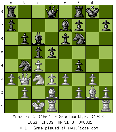 Last move : 0-1 2007 February 5 16:54:46 [Event "FICGS__CHESS__RAPID_B__000032"] [Site "FICGS"] [Date "2007.01.18"] [Round "1"] [White "Menzies,Colin"] [Black "Sacripanti,Attilio"] [Result "0-1"] [WhiteElo "1567"] [BlackElo "1700"] 1.c4 c5 2.g3 Nc6 3.Bg2 b6 4.Nc3 Bb7 5.d3 Nf6 6.Bd2 e6 7.e3 d5 8.Qa4 Be7 9.Nge2 O-O 10.O-O-O Nb4 11.Nf4 g5 12.a3 Bc6 13.Qb3 gxf4 0-1 English : Symmetrical variation Kingside Castling by player Black (move 9) Queenside Castling by player White (move 10) Player Black won this chess game. Follow this game move after move (download)The chessboard is the world, the pieces are the phenomena of the Universe, the rules of the game are what we call the laws of Nature and the player on the other side is hidden from us. (Thomas Huxley) Modernes Schach sorgt sich zuviel um Dinge wie Bauernstruktur usw. Vergessen Sie das, Schachmatt beendet das Spiel! (Nigel Short) Después de la respuesta de las negras a 1.e4 con 1..e5, se quedan siempre tratando de entrar dentro del juego. (Howard Staunton) Vous n'êtes pas toujours obligé de jouer le meilleur coup. Un coup doit être actif, entreprenant, correct et beau ! (David Bronstein) When you've done things right people won't know you've done anything at all. (Futurama)