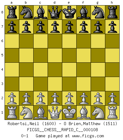 Last move : 0-1 2013 January 4 23:33:31 [Event "FICGS__CHESS__RAPID_C__000108"] [Site "FICGS"] [Date "2012.11.28"] [Round "1"] [White "Robertsi,Neil"] [Black "O Brien,Matthew"] [Result "0-1"] [WhiteElo "1600"] [BlackElo "1511"] 0-1 This chess game has been lost on time (started : 2012.11.28 22:26:15) Player Black won this chess game. Follow this game move after move (download)The combination player thinks forward; he starts from the given position, and tries the forceful moves in his mind. (Emanuel Lasker) Ich verachte die Medien. (Robert James Fischer) El jugador de combinación piensa hacia adelante; comienza de la posición dada y trabaja las movidas contundentes en su mente. (Emanuel Lasker) Toutes les manuvres exécutées sur une colonne ouverte ont pour but ultime l'intrusion définitive sur la septième ou la huitième rangée, en plein cur de la position ennemie. (Aaron Nimzovitch) The real voyage of discovery consists not in seeking new lands but in seeing with new eyes. (Marcel Proust)
