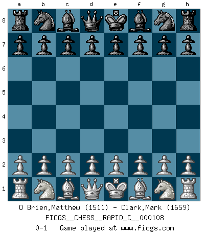 Last move : 0-1 2013 January 4 23:33:31 [Event "FICGS__CHESS__RAPID_C__000108"] [Site "FICGS"] [Date "2012.11.28"] [Round "1"] [White "O Brien,Matthew"] [Black "Clark,Mark"] [Result "0-1"] [WhiteElo "1511"] [BlackElo "1659"] 0-1 This chess game has been lost on time (started : 2012.11.28 22:26:15) Player Black won this chess game. Follow this game move after move (download)Castle early and often. (Rob Sillars) Sie bekommen vielleicht den Eindruck, dass die Spitzenspieler überhaupt gar nicht so stark sind. Aber das stimmt nicht. Es ist eine Illusion. Mit einem Computer an der Seite ist es sehr leicht, Urteile zu fällen, aber wenn man alleine am Brett sitzt, sieht die Sache ganz anders aus. (Vladimir Kramnik) El Ajedrez es el gimnasio de la mente. (Blaise Pascal) 'L'échange des dames est un coup dur pour les deux adversaires...' Un journaliste lors d'une partie du match Spassky-Fischer Knowledge will give you power, but character respect. (Bruce Lee)