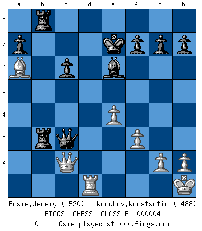 Last move : 0-1 2006 May 27 22:16:38 [Event "FICGS__CHESS__CLASS_E__000004"] [Site "FICGS"] [Date "2006.05.16"] [Round "1"] [White "Frame,Jeremy"] [Black "Konuhov,Konstantin"] [Result "0-1"] [WhiteElo "1520"] [BlackElo "1488"] 1.e4 c5 2.Nf3 Nc6 3.c3 e5 4.d4 exd4 5.cxd4 cxd4 6.Nxd4 Bb4+ 7.Nc3 Qe7 8.f3 d5 9.Nxc6 bxc6 10.Bd3 d4 11.a3 Ba5 12.b4 Bxb4 13.axb4 Qxb4 14.O-O dxc3 15.Ba3 Qd4+ 16.Kh1 Be6 17.Qc2 Rb8 18.Rfd1 Ne7 19.Ba6 Qf6 20.Rd3 Rb3 21.Bxe7 Kxe7 22.Rad1 Rhb8 23.Rxc3 Qxc3 0-1 Sicilian defense Kingside Castling by player White (move 14) Player Black won this chess game. Follow this game move after move (download)It was clear to me that the vulnerable point of the American Grandmaster (Bobby Fischer) was in double-edged, hanging, irrational positions, where he often failed to find a win even in a won position. (Efim Geller) Ich trinke, ich rauche, ich spiele, ich liebe Frauen aber Fernschach ist ein Laster, das ich nicht habe. (Mikhail Nekhemyevich Tal) El pensamiento metódico es mas útil en el Ajedrez que la inspiración. (C. J. S. Purdy) Des points faibles ou des trous dans la position de l'adversaire doivent être occupés par des pièces et non pas par des pions. (Siegbert Tarrasch) They say in chess you've got to kill the queen, and then you mate it... Oh I, do you ? (Red Hot Chili Peppers, Fortune faded)