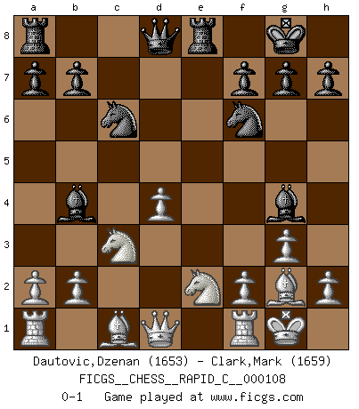 Last move : 0-1 2013 March 13 5:36:30 [Event "FICGS__CHESS__RAPID_C__000108"] [Site "FICGS"] [Date "2012.11.28"] [Round "1"] [White "Dautovic,Dzenan"] [Black "Clark,Mark"] [Result "0-1"] [WhiteElo "1653"] [BlackElo "1659"] 1.c4 e5 2.g3 Nf6 3.Bg2 Bc5 4.Nc3 O-O 5.e3 d5 6.cxd5 c6 7.d4 exd4 8.exd4 Bb4 9.dxc6 Nxc6 10.Nge2 Re8 11.O-O Bg4 0-1 English Opening Kingside Castling by player Black (move 4) Kingside Castling by player White (move 11) Player Black won this chess game. Follow this game move after move (download)I look one move ahead... the best ! (Siegbert Tarrasch) Ich rechne überhaupt nicht voraus. Ich gewinne auch so. (Robert James Fischer) De todos mis libros Rusos, la defensa contiene y difunde el 'calor' mas grande que pudiese verse extraño al observar lo supremamente abstracto que el Ajedrez supuestamente es. (Vladimir Nabokov) Aidez vos pièces, elles vous aideront. (Paul Morphy) A good programmer is someone who always looks both ways before crossing a one-way street. (Doug Linder)