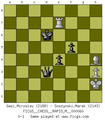 Last move : 0-1 2013 May 4 9:37:42 [Event "FICGS__CHESS__RAPID_M__000060"] [Site "FICGS"] [Date "2012.11.29"] [Round "1"] [White "Gazi,Miroslav"] [Black "Soszynski,Marek"] [Result "0-1"] [WhiteElo "2188"] [BlackElo "2143"] 1.d4 Nf6 2.Bg5 d5 3.Nd2 c5 4.dxc5 e6 5.Nb3 Nbd7 6.e3 Nxc5 7.Nxc5 Bxc5 8.Bb5+ Kf8 9.Bd3 e5 10.c3 Be6 11.Ne2 h6 12.Bh4 g6 13.O-O Kg7 14.b4 Bb6 15.a4 a5 16.bxa5 Rxa5 17.Qb1 g5 18.Bg3 Bc7 19.h3 Bc8 20.Qb2 Qe7 21.c4 Rd8 22.Rac1 dxc4 23.Bxc4 Bd6 24.Bb5 Bd7 25.Rfd1 Bxb5 26.axb5 Re8 27.Qd2 Bb4 28.Qd3 Qe6 29.Bh2 Ra3 30.Qb1 Bf8 31.Rc3 Ra4 32.Rc2 Rea8 33.Ng3 Ra1 34.Qxa1 Rxa1 35.Rxa1 Kg6 36.R2c1 h5 37.Nf1 Ne4 38.Ra8 Bb4 39.Rg8+ Kh7 40.Rgc8 h4 41.R8c2 Ba3 42.Rb1 Qd5 43.Re1 Qb3 44.R1e2 f6 45.g3 Kg6 46.Kg2 Qxb5 47.f3 Nc5 48.gxh4 gxh4 49.Bg1 Nd3 50.Kh1 Qb1 51.Rg2+ Kf5 52.Rc3 Qxf1 53.Rxa3 Ke6 54.Rb3 b5 55.Rxb5 Qxf3 56.Kh2 Ne1 57.Rb6+ Kf7 58.R6b2 Nxg2 59.Rxg2 f5 60.Bf2 e4 61.Bxh4 Qxe3 62.Rc2 Qd3 63.Rc7+ Ke6 64.Re7+ Kd6 0-1 Trompowsky attack (Ruth, Opovcensky Opening) Kingside Castling by player White (move 13) 10 pieces endgame at move 59 : White KRBPP , Black KQPPP WHITE : King + 1 Rook 1 Bishop 2 Pawns BLACK : King + 1 Queen 3 Pawns 9 pieces endgame at move 61 : White KRBPP , Black KQPP WHITE : King + 1 Rook 1 Bishop 2 Pawns BLACK : King + 1 Queen 2 Pawns 8 pieces endgame at move 61 : White KRBP , Black KQPP WHITE : King + 1 Rook 1 Bishop 1 Pawn BLACK : King + 1 Queen 2 Pawns Player Black won this chess game. Follow this game move after move (download)Winning isn't everything... but losing is nothing. (Mednis) Besser ein falscher Plan, logisch durchgeführt, als gar kein Plan. (Viktor Kortschnoi) Todo se encuentra en un estado de flujo y esto incluye al mundo del Ajedrez. (Mikhail Botvinnik) Je ne crois pas en la psychologie, je crois aux bons coups. (Robert Fischer) Ah, beer! The cause of, and the solution to, all of life's problems. (Homer Simpson)