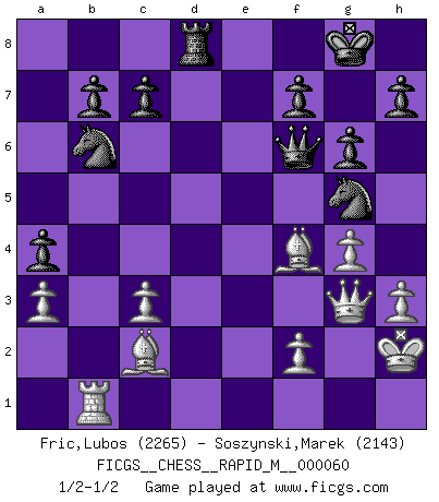 Last move : 1/2-1/2 2013 March 1 0:15:48 [Event "FICGS__CHESS__RAPID_M__000060"] [Site "FICGS"] [Date "2012.11.29"] [Round "1"] [White "Fric,Lubos"] [Black "Soszynski,Marek"] [Result "1/2-1/2"] [WhiteElo "2265"] [BlackElo "2143"] 1.Nf3 Nf6 2.c4 g6 3.d4 Bg7 4.g3 d5 5.cxd5 Nxd5 6.Bg2 Nb6 7.O-O Nc6 8.e3 O-O 9.Nc3 Re8 10.h3 a5 11.Kh2 a4 12.Rb1 Be6 13.Nd2 Bf5 14.Nde4 e5 15.d5 Nb4 16.g4 Bxe4 17.Bxe4 Qd7 18.a3 Na6 19.Bc2 e4 20.Nxe4 Rad8 21.Nc3 Bxc3 22.bxc3 Nc5 23.e4 Nxe4 24.Qf3 Qxd5 25.Rd1 Qe5+ 26.Bf4 Ng5 27.Qg3 Qf6 28.Rxd8 Rxd8 1/2-1/2 Reti Opening Kingside Castling by player White (move 7) Kingside Castling by player Black (move 8) This chess game ended in a draw. Follow this game move after move (download)When in doubt... play Chess ! (Tevis) Zu meiner Zeit war ein 20 jähriger ein junger Spieler, heute ist er ein Veteran. (Garry Kasparov) Muchos se han convertido en Maestros de Ajedrez, nadie se ha convertido en el Maestro del Ajedrez. (Siegbert Tarrasch) Je fais ceci parce que dans cinquante coups j'obtiendrai cela; je m'appelle Mikhail Moisevitch Botvinnik. (Botvinnik) Whatever you do, don't be bored. This is absolutely the most exciting time we could have possibly hoped to be alive. And things are just starting. (From movie Waking life)