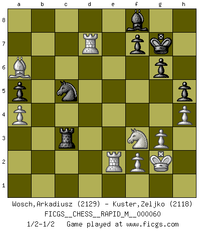 Last move : 1/2-1/2 2013 March 26 13:24:3 [Event "FICGS__CHESS__RAPID_M__000060"] [Site "FICGS"] [Date "2012.11.29"] [Round "1"] [White "Wosch,Arkadiusz"] [Black "Kuster,Zeljko"] [Result "1/2-1/2"] [WhiteElo "2129"] [BlackElo "2118"] 1.e4 d6 2.d4 Nf6 3.Nc3 g6 4.Nf3 Bg7 5.Be2 O-O 6.O-O Nc6 7.d5 Nb8 8.h3 c6 9.Re1 Nbd7 10.Be3 Qc7 11.Qd2 cxd5 12.exd5 a6 13.a4 b6 14.Ra3 Bb7 15.Rd1 Rac8 16.Rb3 a5 17.Ng5 h6 18.Nf3 Kh7 19.Nh2 Nc5 20.Bxc5 Qxc5 21.Nf1 h5 22.Ng3 Kg8 23.Bb5 Rc7 24.Bd3 R7c8 25.Qg5 Rce8 26.Re1 Nh7 27.Qc1 Nf6 28.Bb5 Rc8 29.Rxe7 Bxd5 30.Nxd5 Nxd5 31.Re2 Nc7 32.Ne4 Qe5 33.Ng5 Qd4 34.Nf3 Qc5 35.h4 d5 36.g3 Qd6 37.Qe3 Ne6 38.Rd3 d4 39.Qd2 Nc5 40.Ra3 Rc7 41.Ne1 Ne6 42.Ra1 d3 43.Qxd3 Qxd3 44.Bxd3 Bxb2 45.Rb1 Bd4 46.Nf3 Bc5 47.Kg2 Kg7 48.c3 Rd8 49.Ba6 Bf8 50.Rxb6 Rxc3 51.Rb7 Nc5 52.Ra7 Rd7 53.Rxd7 1/2-1/2 Pirc : Classical system, 5.Be2 Kingside Castling by player Black (move 5) Kingside Castling by player White (move 6) This chess game ended in a draw. Follow this game move after move (download)On the chessboard, lies and hypocrisy do not survive long. (Emanuel Lasker) Ohne Leiden bildet sich kein Charakter. (Ernst Freiherr von Feuchtersleben) Nunca antes ha habido un jugador de Ajedrez con tal conocimiento a fondo de las complejidades del juego y una inmensa voluntad absolutamente indomable de ganar. Yo pienso que Fischer es el jugador mas grande que jamás haya existido. (Lisa Lane) En blitz, le Cavalier l'emporte sur le Fou. (Vlastimil Hort) A good teacher is like a candle - it consumes itself to light the way for others. (Author unknown)