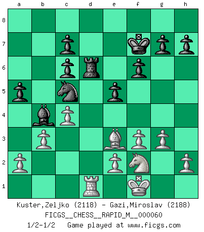 Last move : 1/2-1/2 2013 January 27 21:50:31 [Event "FICGS__CHESS__RAPID_M__000060"] [Site "FICGS"] [Date "2012.11.29"] [Round "1"] [White "Kuster,Zeljko"] [Black "Gazi,Miroslav"] [Result "1/2-1/2"] [WhiteElo "2118"] [BlackElo "2188"] 1.c4 e5 2.g3 Nf6 3.Bg2 d5 4.cxd5 Nxd5 5.Nc3 Nf6 6.Nf3 Nc6 7.d3 Be7 8.O-O O-O 9.Nd2 Rb8 10.Nc4 Be6 11.Bxc6 Bxc4 12.dxc4 bxc6 13.Qxd8 Rfxd8 14.b3 Bb4 15.Na4 Nd7 16.Be3 a5 17.Rad1 Nf8 18.Rxd8 Rxd8 19.Nb2 Ne6 20.Rd1 Rd6 21.f3 f6 22.Nd3 Kf7 23.Kf1 Nc5 24.Nf2 1/2-1/2 English Opening Kingside Castling by player White (move 8) Kingside Castling by player Black (move 8) This chess game ended in a draw. Follow this game move after move (download)It is difficult to play against Einstein's theory --on his first loss to Fischer. (Mikhail Tal) Ich bewundere Kasparows phantasievolle Angriffssiege aus den Achtzigern und Neunzigern, aber wenn man sie mit dem Computer überprüft, nimmt der Computer in jeder zweiten Partie die Opfer an, verteidigt sich und gewinnt. (Vladimir Kramnik) Un entendimiento a fondo de las continuaciones típicas del mate, hace de las combinaciones de sacrificio mas complicadas conducirlas a ellas no solo sin dificultad, sino casi de una manera natural. (Siegbert Tarrasch) Soyez une menace à chaque fois que vous vous asseyez pour jouer. (Ken Smith) Life is painting a picture, not doing a sum. (Oliver Wendell Holmes, Jr.)