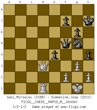 Last move : 1/2-1/2 2013 March 6 7:27:31 [Event "FICGS__CHESS__RAPID_M__000060"] [Site "FICGS"] [Date "2012.11.29"] [Round "1"] [White "Gazi,Miroslav"] [Black "Simmelink,Joop"] [Result "1/2-1/2"] [WhiteElo "2188"] [BlackElo "2211"] 1.d4 d5 2.c4 c6 3.Nf3 Nf6 4.Nc3 e6 5.Bg5 dxc4 6.a4 Bb4 7.e4 c5 8.Bxc4 cxd4 9.Nxd4 h6 10.Bf4 Nxe4 11.O-O Bxc3 12.bxc3 Nxc3 13.Bb5+ Bd7 14.Qf3 Nd5 15.Bd6 Nc6 16.Rfe1 Nde7 17.Nxc6 Bxc6 18.Rad1 Bxb5 19.axb5 O-O 20.Ba3 Nd5 21.Bxf8 Qxf8 22.Qd3 Qc5 23.Rc1 Qb6 24.g3 Rd8 25.Qc4 Kh7 26.Ra1 Rd7 27.Rec1 Nc7 28.Rd1 Nd5 29.Qe4+ g6 30.Qd3 Nf6 31.Qa3 Qxb5 32.Qxa7 Rc7 33.Qd4 Qf5 34.Rac1 e5 35.Qb6 Rxc1 36.Rxc1 h5 37.Qxb7 Ne4 38.Rf1 Nd2 39.Rd1 Ne4 40.Qa7 h4 41.Qe3 Ng5 42.Qd3 e4 1/2-1/2 QGD Slav : 4.Nc3 Kingside Castling by player White (move 11) Kingside Castling by player Black (move 19) This chess game ended in a draw. Follow this game move after move (download)In life, as in Chess, one's own Pawns block one's way. A man's very wealth, ease, leisure, children, books, which should help him to win, more often checkmate him. (Charles Buxton) Es gibt Leute, die glauben, alles wäre vernünftig, was man mit einem ernsthaften Gesicht tut. (Georg Christoph Lichtenberg) Si un gobernante no entiende al Ajedrez, ¿como puede governar él un reinado?. (El Rey Khusros II) J'apprécie les joueurs d'est-indienne, c'est grâce à eux que je nourris ma famille depuis tant d'années. (Petrosian) I just play for fun. (Anna Kournikova)