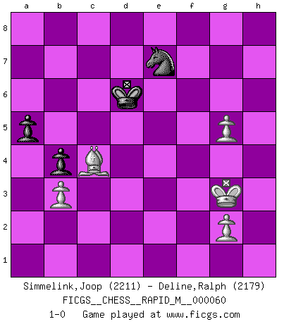 Last move : 1-0 2012 December 18 15:31:38 [Event "FICGS__CHESS__RAPID_M__000060"] [Site "FICGS"] [Date "2012.11.29"] [Round "1"] [White "Simmelink,Joop"] [Black "Deline,Ralph"] [Result "1-0"] [WhiteElo "2211"] [BlackElo "2179"] 1.e4 e6 2.d4 d5 3.Nc3 Nf6 4.Bg5 Bb4 5.e5 h6 6.Bc1 Ne4 7.Qg4 g6 8.Nge2 Nxc3 9.Nxc3 c5 10.a3 Qa5 11.axb4 Qxa1 12.Qf4 g5 13.Qd2 cxb4 14.Nb5 Kd7 15.Bd3 Nc6 16.O-O a6 17.Nd6 Rf8 18.c4 Kc7 19.f4 Qa4 20.Qf2 Bd7 21.fxg5 hxg5 22.Bxg5 Rg8 23.h4 Qb3 24.Qd2 Rg7 25.cxd5 Qxd5 26.Be3 Rg4 27.Bc4 Qa5 28.Rxf7 Qa1+ 29.Bf1 Rag8 30.Bg5 Rxd4 31.Qf2 Rxg5 32.hxg5 Qd1 33.Rxd7+ Kxd7 34.Qf7+ Kd8 35.Qxe6 Ne7 36.Nxb7+ Ke8 37.Nd6+ Kd8 38.Qf7 Rxd6 39.exd6 Qd4+ 40.Qf2 Qxd6 41.Qf6 Qc5+ 42.Kh2 a5 43.b3 Kc7 44.Bc4 Qd6+ 45.Qxd6+ Kxd6 46.Kg3 1-0 Joop Simmelink Qxa1 looks risky. I had an ICCF-game (Paul i-Rak 2011) in which white won quite easily so I simply followed that (19..Qa2 instead of your Kc7) Joop Simmelink Thanks for the game! French : MacCutcheon, Dr. Olland (Dutch) variation Kingside Castling by player White (move 16) 10 pieces endgame at move 45 : White KQBPPP , Black KNPP WHITE : King + 1 Queen 1 Bishop 3 Pawns BLACK : King + 1 Knight 2 Pawns 9 pieces endgame at move 45 : White KBPPP , Black KNPP WHITE : King + 1 Bishop 3 Pawns BLACK : King + 1 Knight 2 Pawns Player White won this chess game. Follow this game move after move (download)What is the difference between chess and football? Everybody understands football, but nobody plays it. Everybody plays chess, but nobody understands it. Everything is relative. (Vladimir Kramnik) Man wirke der falschen Auffassung entgegen, als ob jeder Zug Unmittelbares zu leisten habe; auch Werte- und Ruhezüge haben ihre Existenzberechtigung. (Aaron Nimzowitsch) En el Ajedrez, cuando menos, el valiente hereda la tierra. (Edmar Mednis) Roi des jeux et jeu des rois, les échecs portent en eux un sentiment d'infini. Ils donnent à celui qui s'est efforcé d'en approfondir les arcanes l'impression de n'être pas à la mesure de l'homme; en fait, ils constituent un résumé de l'univers, un microcosme, et figurent cette grande échelle qui, dans les plans de la lumière descend jusqu'à la matière, qui des abîmes insondables remonte jusqu'en l'infini de Dieu. (Pyrame) Perfection is achieved, not when there is nothing more to add, but when there is nothing left to take away. (Antoine de Saint-Exupéry)