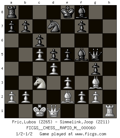 Last move : 1/2-1/2 2013 February 12 14:4:13 [Event "FICGS__CHESS__RAPID_M__000060"] [Site "FICGS"] [Date "2012.11.29"] [Round "1"] [White "Fric,Lubos"] [Black "Simmelink,Joop"] [Result "1/2-1/2"] [WhiteElo "2265"] [BlackElo "2211"] 1.Nf3 d5 2.d4 c6 3.Bf4 Qb6 4.Qc1 Nf6 5.e3 Bf5 6.c4 e6 7.c5 Qd8 8.Be2 Nbd7 9.h3 Ne4 10.Nc3 g5 11.Bh2 h5 12.Nd2 Nxd2 13.Qxd2 g4 14.hxg4 hxg4 15.O-O-O Qh4 16.Rdf1 e5 17.Qd1 Qg5 18.Bf4 Qg7 19.Rxh8 Qxh8 20.Rh1 Qg8 21.Bg3 Qg5 1/2-1/2 Reti Opening Queenside Castling by player White (move 15) This chess game ended in a draw. Follow this game move after move (download)Many Chess players were surprised when after the game, Fischer quietly explained: 'I had already analyzed this possibility' in a position which I thought was not possible to foresee from the opening. (Mikhail Tal) Intelligenz läßt sich nicht am Weg, sondern nur am Ergebnis feststellen. (Garry Kasparov) No nos podemos resistir a la fascinación de un sacrificio ya que la pasión por los sacrificios es parte de la naturaleza de un jugador de Ajedrez. (Rudolf Spielman) Tout change constamment, y compris dans le monde des Echecs. (Botvinnik) Better than a thousand days of diligent study is one day with a great teacher. (Japanese proverb)