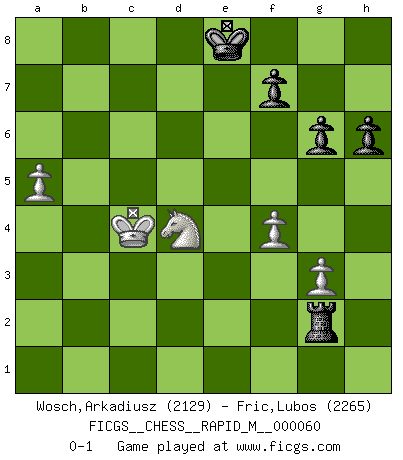 Last move : 0-1 2013 April 18 3:35:54 [Event "FICGS__CHESS__RAPID_M__000060"] [Site "FICGS"] [Date "2012.11.29"] [Round "1"] [White "Wosch,Arkadiusz"] [Black "Fric,Lubos"] [Result "0-1"] [WhiteElo "2129"] [BlackElo "2265"] 1.d4 d5 2.Nf3 Nf6 3.c4 c6 4.Nc3 e6 5.e3 Nbd7 6.Qc2 Bd6 7.Be2 dxc4 8.Bxc4 O-O 9.O-O a6 10.Rd1 b5 11.Be2 Qc7 12.e4 e5 13.g3 Re8 14.a3 h6 15.b4 Bb7 16.Be3 Ng4 17.dxe5 Nxe3 18.exd6 Nxc2 19.dxc7 Nxa1 20.Rxd7 Bc8 21.Rd1 Nc2 22.Rd6 Bb7 23.Nd4 Nxd4 24.Rxd4 c5 25.Rd7 cxb4 26.axb4 Kf8 27.Bg4 Bc8 28.Nd5 Bxd7 29.Bxd7 Rxe4 30.c8Q+ Rxc8 31.Bxc8 a5 32.bxa5 b4 33.Kf1 Rc4 34.Ba6 Rc1+ 35.Ke2 b3 36.Bd3 b2 37.Ne3 b1Q 38.Bxb1 Rxb1 39.Kd3 Rb2 40.f4 Rxh2 41.Kc4 Ke8 42.Nf5 g6 43.Nd4 Rg2 0-1 Queen's pawn game Kingside Castling by player Black (move 8) Kingside Castling by player White (move 9) Promotion Queen by player White (move 30) Promotion Queen by player Black (move 37) 10 pieces endgame at move 40 : White KNPPP , Black KRPPP WHITE : King + 1 Knight 3 Pawns BLACK : King + 1 Rook 3 Pawns Player Black won this chess game. Follow this game move after move (download)We must make sure that Chess will not be like a dead language, very interesting, but for a very small group. (Sytze Faber) Schach ist mein Leben, meine Leidenschaft, was ich gelernt habe und seit meinem 14. Lebensjahr profimässig praktiziere. Darauf zu verzichten, würde mir sehr schwer fallen. (Viktor Kortschnoi) El Ajedrez es la vida. (Bobby Fischer) Des points faibles ou des trous dans la position de l'adversaire doivent être occupés par des pièces et non pas par des pions. (Siegbert Tarrasch) See no evil, hear no evil, speak no evil. (The 3 monkeys)