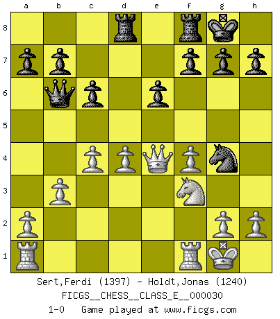 Last move : 1-0 2007 May 16 3:20:54 [Event "FICGS__CHESS__CLASS_E__000030"] [Site "FICGS"] [Date "2007.01.19"] [Round "1"] [White "Sert,Ferdi"] [Black "Holdt,Jonas"] [Result "1-0"] [WhiteElo "1397"] [BlackElo "1240"] 1.d4 d5 2.Nf3 Nf6 3.c4 c6 4.Nc3 Bf5 5.e3 e6 6.Bd3 Bxd3 7.Qxd3 Bd6 8.e4 dxe4 9.Nxe4 Nxe4 10.Qxe4 Bb4+ 11.Bd2 Bxd2+ 12.Nxd2 O-O 13.O-O Nd7 14.f4 Nf6 15.Qe3 Qb6 16.b3 Rad8 17.Nf3 Ng4 18.Qe4 1-0 This chess game has been lost on time (started : 2007.01.19 15:39:18) Queen's pawn game Kingside Castling by player Black (move 12) Kingside Castling by player White (move 13) Player White won this chess game. Follow this game move after move (download)In the perfect Chess combination as in a first-rate short story, the whole plot and counter-plot should lead up to a striking finale, the interest not being allayed until the very last moment. (Yates and Winter) Garry Kasparov war erst in der Großmeister-Organisation GMA, dann in der Profischach-Vereinigung PCA, zum Schluss kehrte er wieder in den Schoß der FIDE zurück. Aber gut, manche Leute sind flexibel (Viswanathan Anand) Las ideas audaces son como las piezas del Ajedrez que avanzan hacia adelante. Ellas pueden ser vencidas, pero también pueden iniciar una partida victoriosa. (Goethe) Il a essayé de se convaincre qu'il pourrait empêcher toutes les erreurs et ne jamais perdre. L'horreur ! Gary Kasparov au sujet de Robert Fischer. The man who strikes first admits that his ideas have given out. (Chinese proverb)